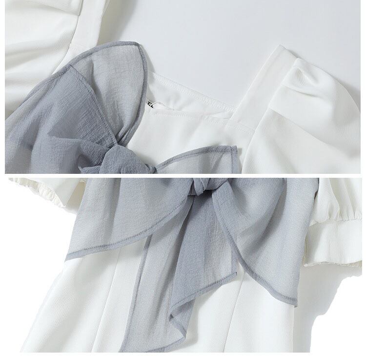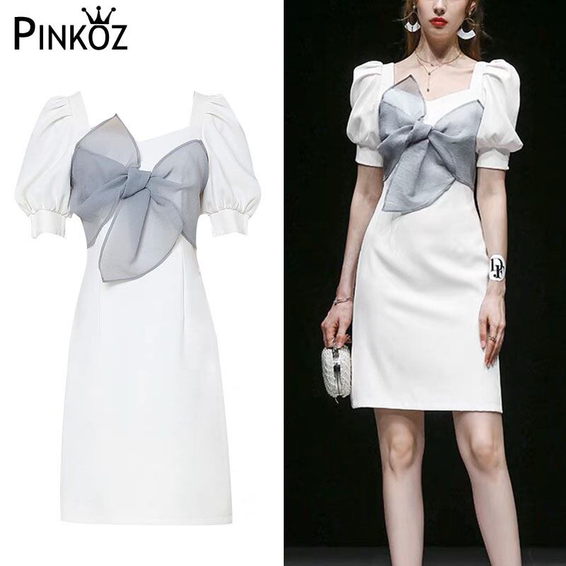 Pinkoz ホワイト ドレス ミニ ストレート スクエア カラー ショート スリーブ オフィス レディ サマー ドレス パーティー ボウ メッシュ デザイナー ローブ ロング ピンク リボン 半袖 ハーフスリーブ 夏物 スクウェア 会社 学校 通勤や通学にも