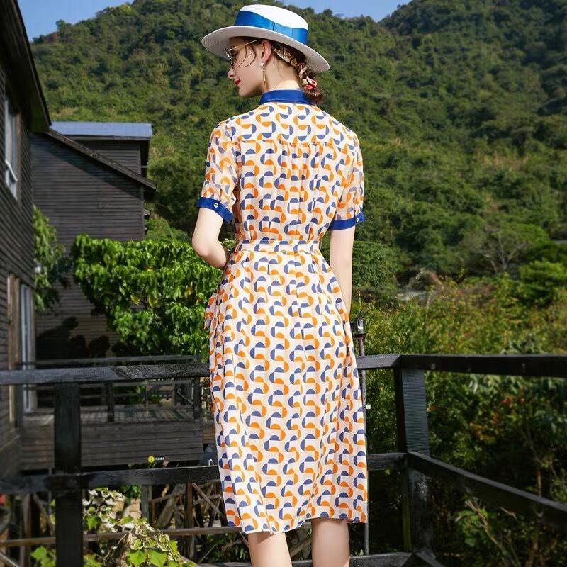 Pinkoz エレガントな膝丈の女性の夏のドレス幾何学模様プリント折り半袖カジュアルルーズウエストサッシュプラスサイズのローブ ショート ピンク ハーフスリーブ 大きめサイズ サマー 夏物