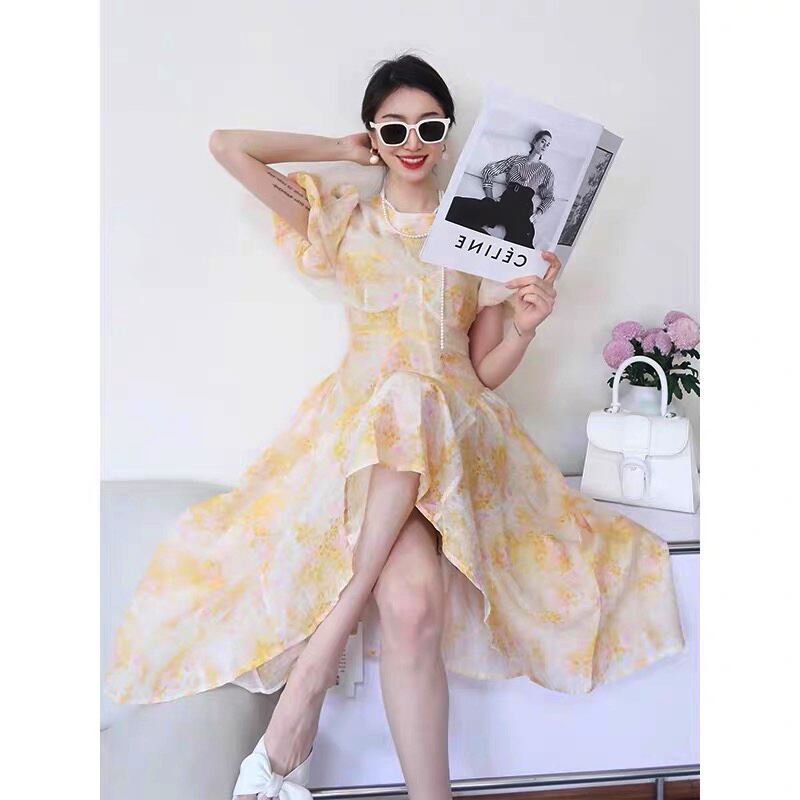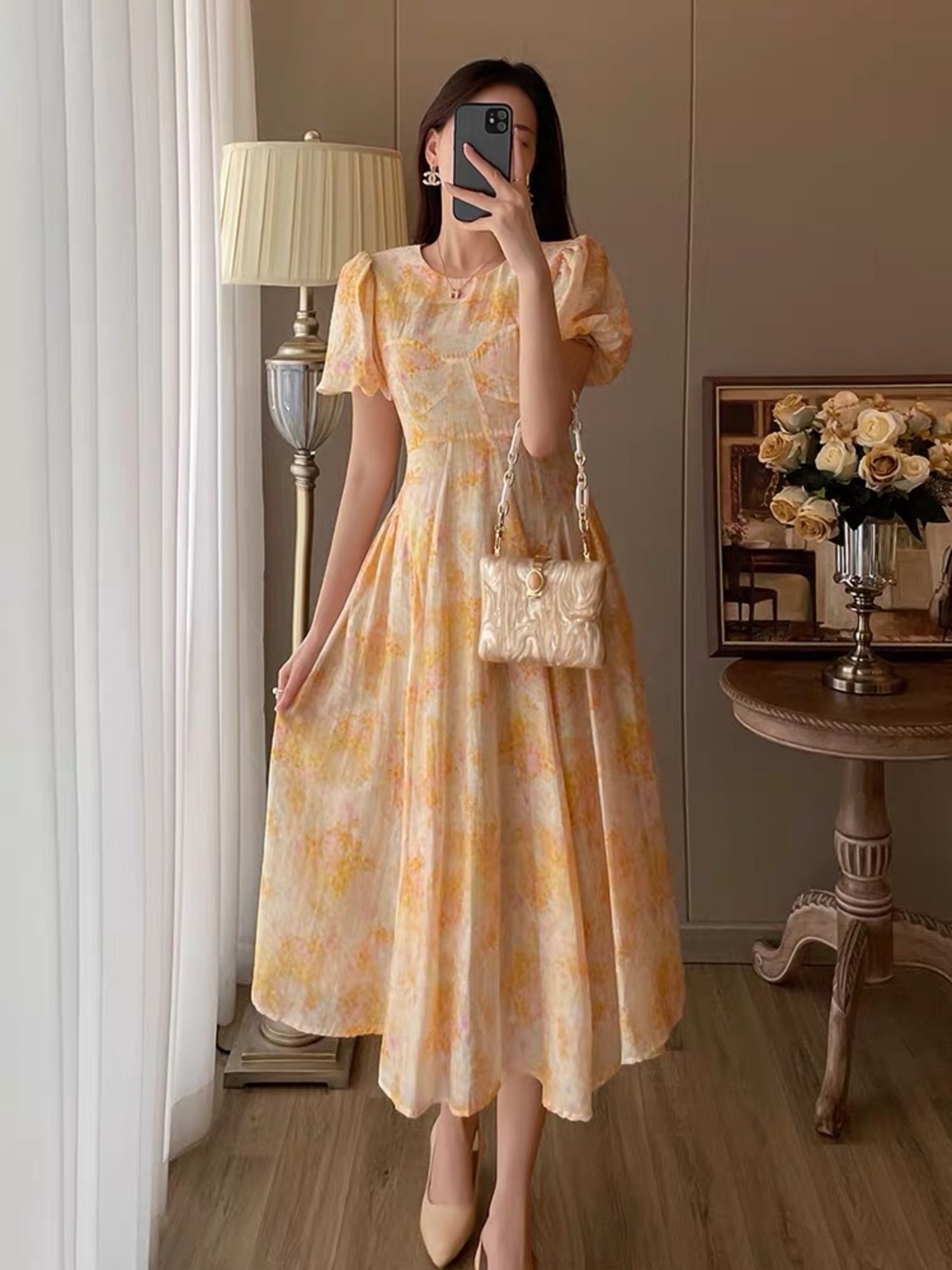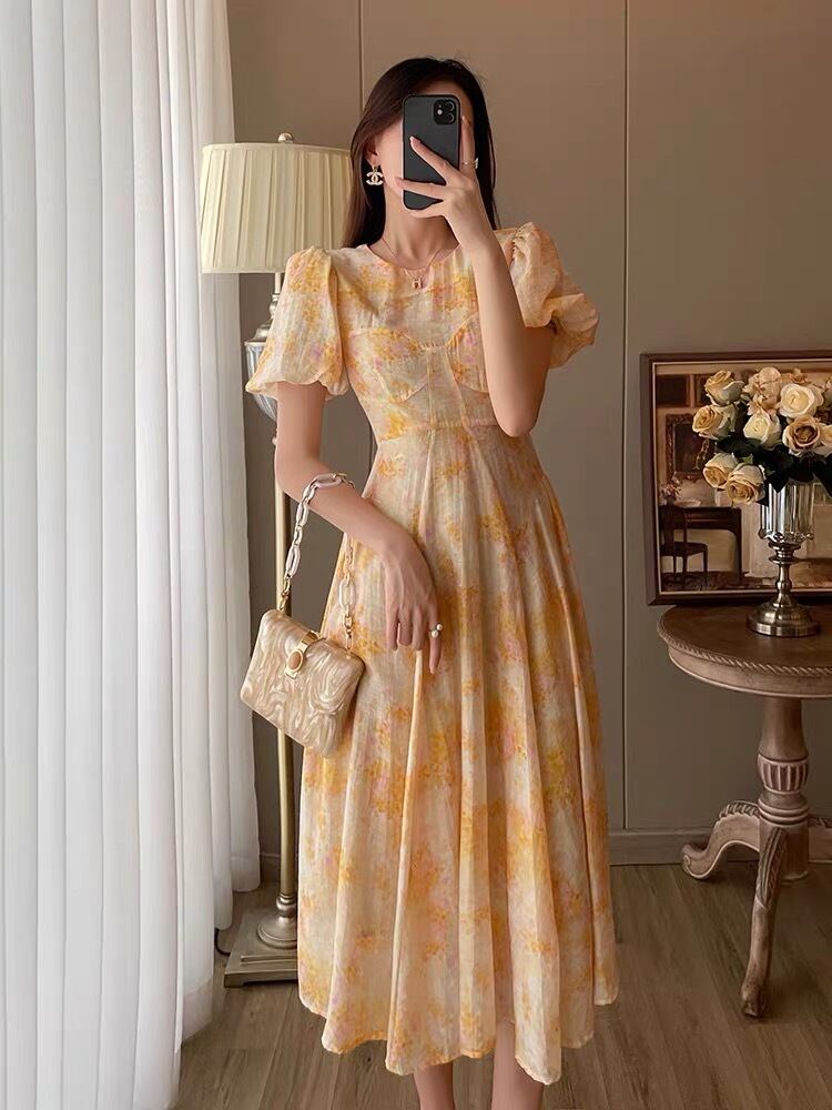 Pinkoz 滑走路デザイナー O ネック パフ スリーブ花柄プリント ヴィンテージ ミディ ドレス ファッション女性 vestidos シックなローブ デ mujer ファム ピンク Oネック フェミニン ビンテージ