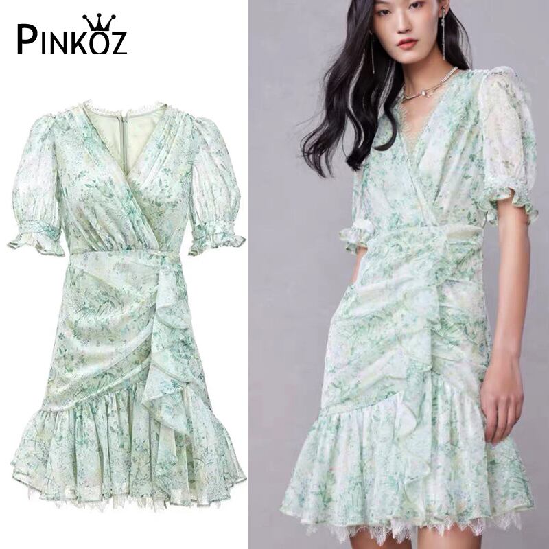 Pinkoz 女性 elgant 春夏ライトグリーンフローラルプリントパッチワークレース非対称ビーズファッション衣類ミニ vestidos ピンク スプリング 春物 サマー 夏物 花柄