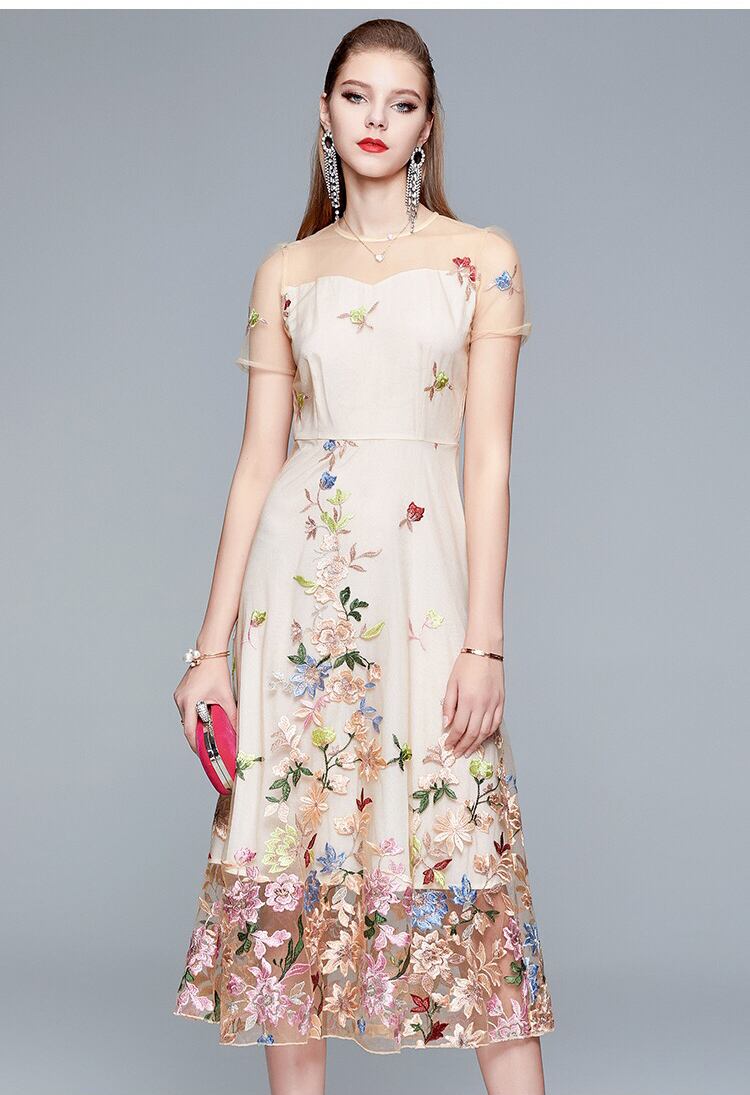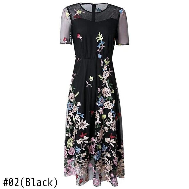 Pinkoz ミディ ドレス フラワー刺繍黒パッチワーク メッシュ フェスタ花柄パーティー デザイナー エレガントなドレス夏 vestidos シックな za ピンク ブラック サマー 夏物 フラワーデザイン