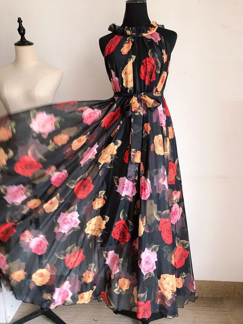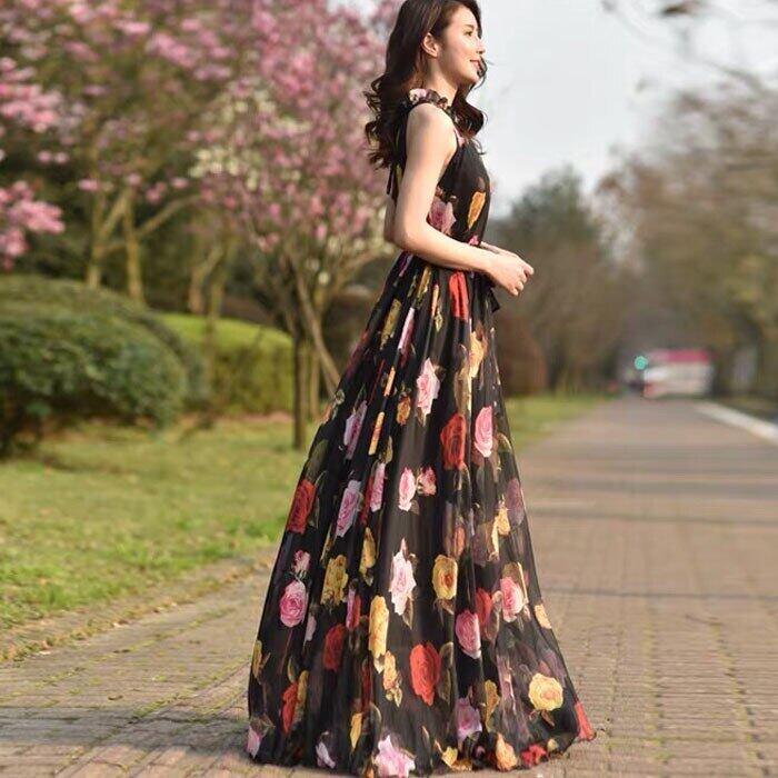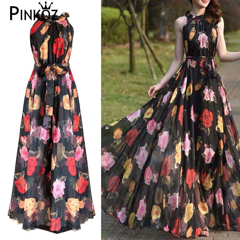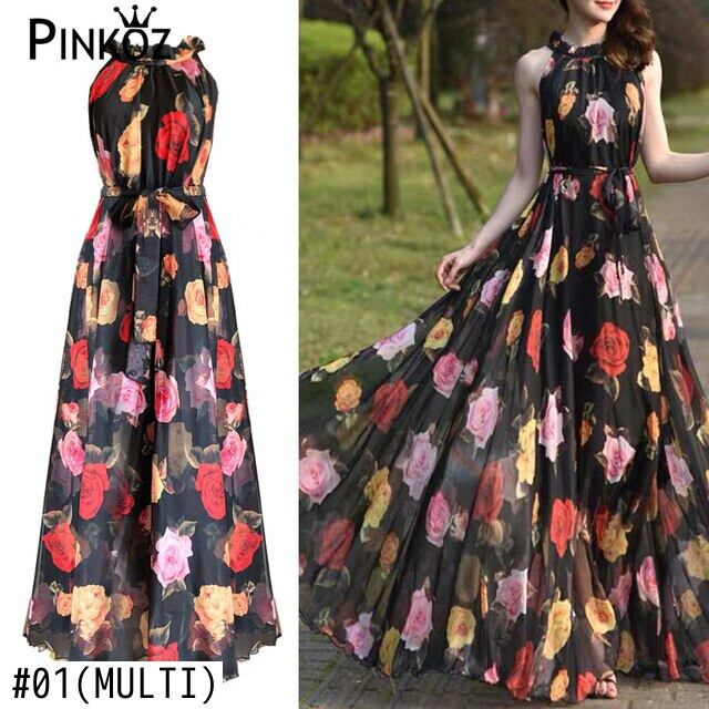 Pinkoz バラの花シャーリング襟レース アップ サッシ マキシ ソフト ルーズ ラグジュアリー ロング ドレス夏ノースリーブ シフォン ホリデー パーティー ピンク サマー 夏物 レースアップ フラワーデザイン