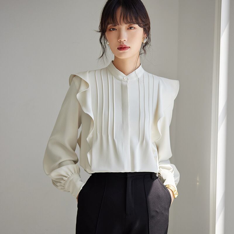 Pinkoz デザイナー ホワイト プリーツ スタンドカラー 長袖 エレガント ブラウス ファム シック シャツ 春 秋 OL トップス ベスト フェスタ ロング ピンク スプリング 春物 オータム 秋物 フェミニン