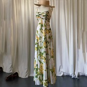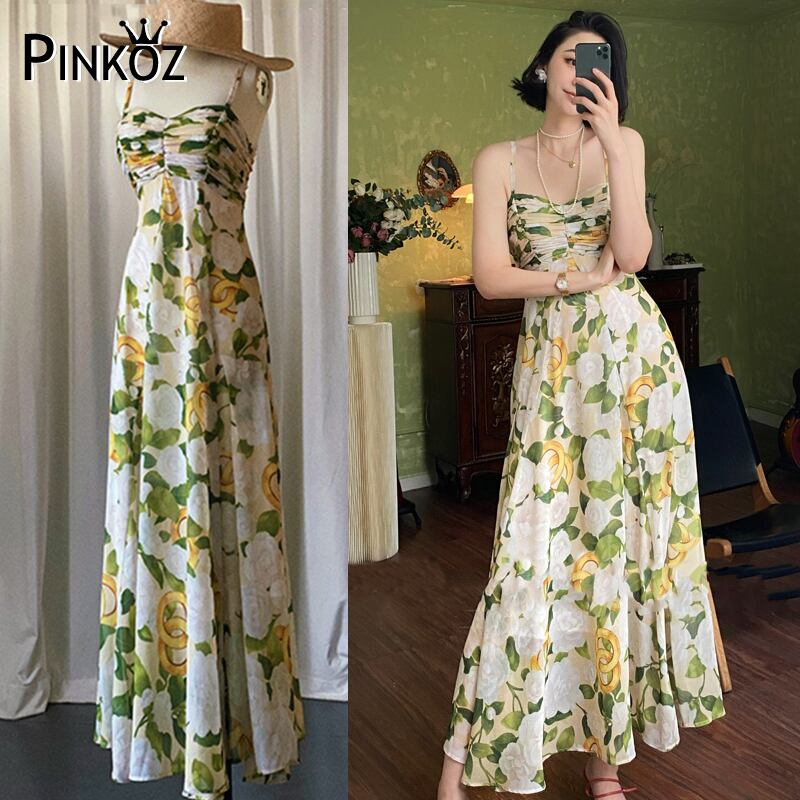 Pinkoz 新人デザイナーのスタイリッシュな黄色花柄プリント夏ぬるぬるドレスキャミソールスパゲッティストラップシックなビーチローブデ mujer ドレス ピンク サマー 夏物
