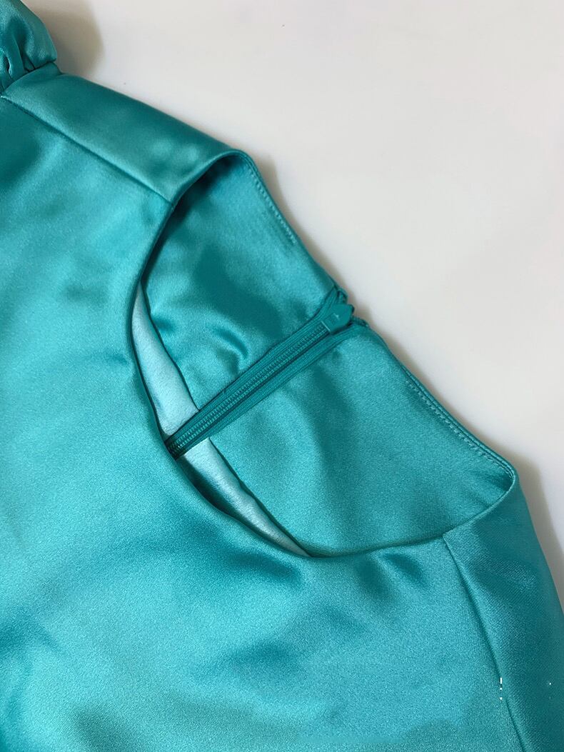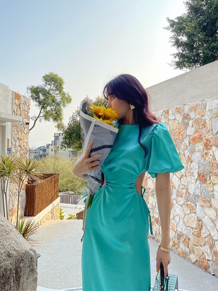 Pinkoz グリーン サテン ミディ O ネック パフ スリーブ夏休日ドレス パーティー中空アウト レースアップ セクシーなスリム ナイト クラブ ドレス vestidos ピンク サマー 夏物 Oネック