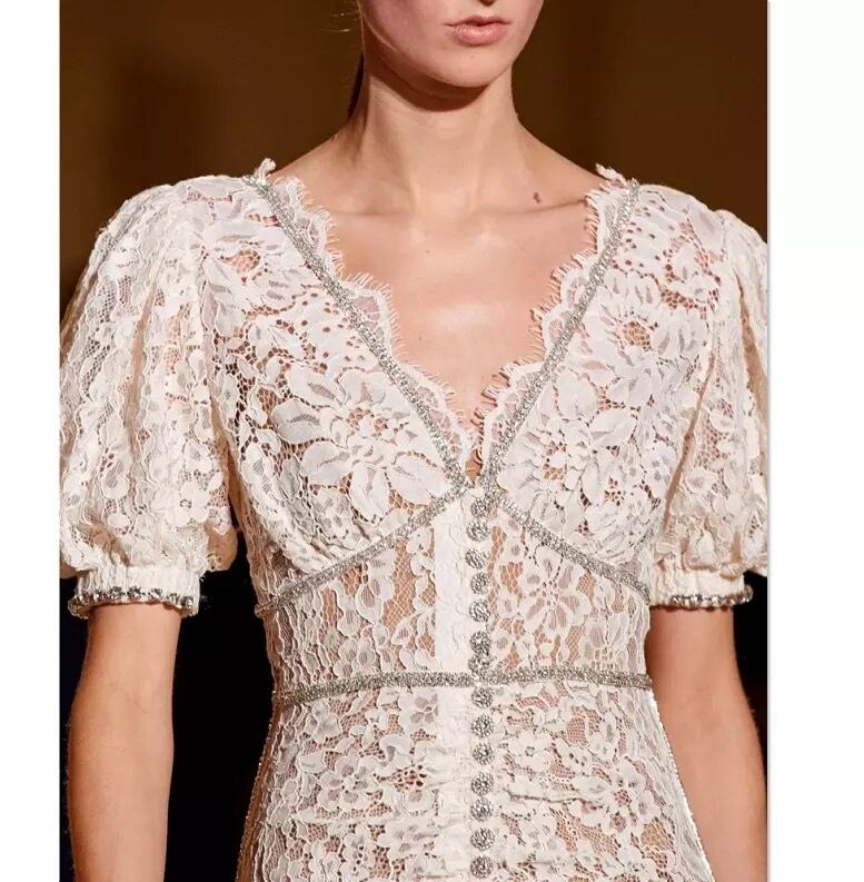 Pinkoz クリーム ホワイト レース V ネック パフ スリーブ ミディ ドレス Crysral ハイ パート ディナー自由奔放に生きるドレス 夏 ropa mujer ピンク サマー 夏物 Vネック
