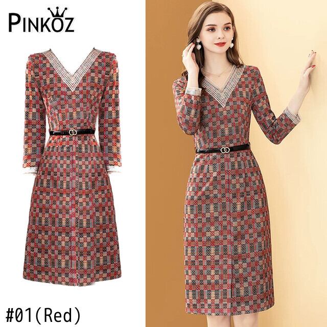 Pinkoz ビッグサイズの女性の膝丈ドレス赤チェック柄プリント v ネックパッチワークペンシルエレガントなドレスとベルトカジュアル vestidos traf ピンク レッド ハーネス Vネック