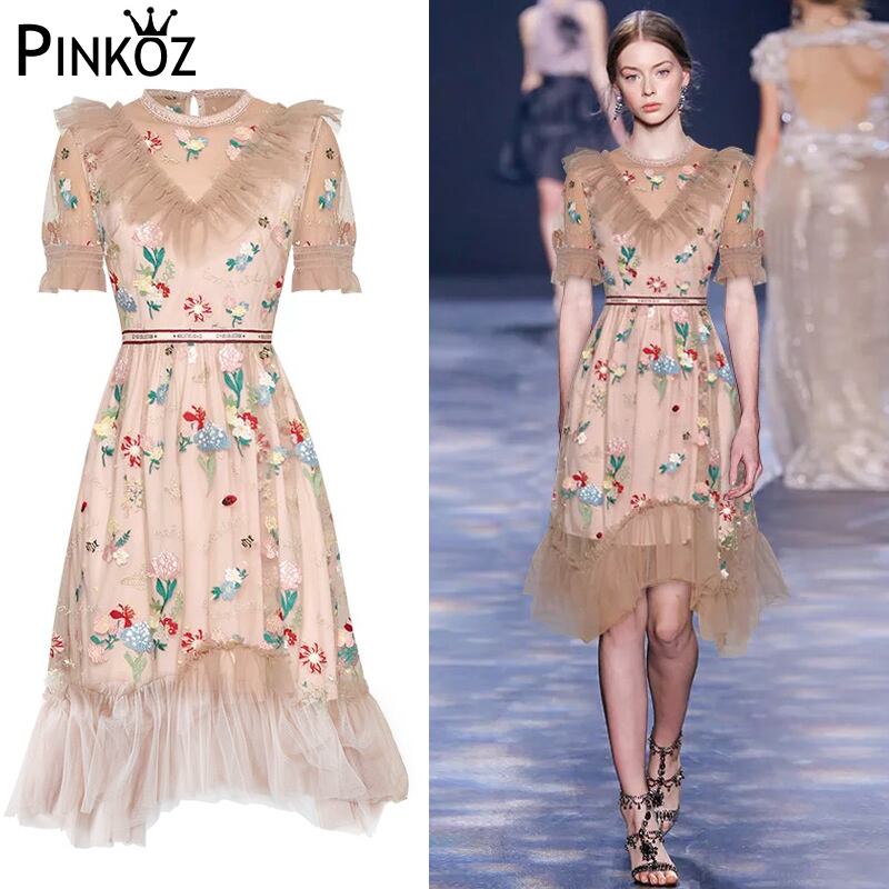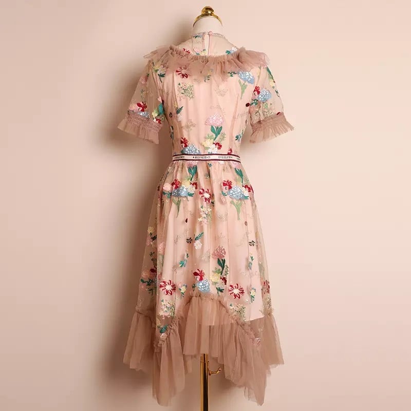 Pinkoz 滑走路デザイナー非対称花刺繍半袖ミディドレスハイウエストエレガントな女性レディパーティードレスローブ ハイウェスト ショート ピンク ハーフスリーブ フラワーデザイン