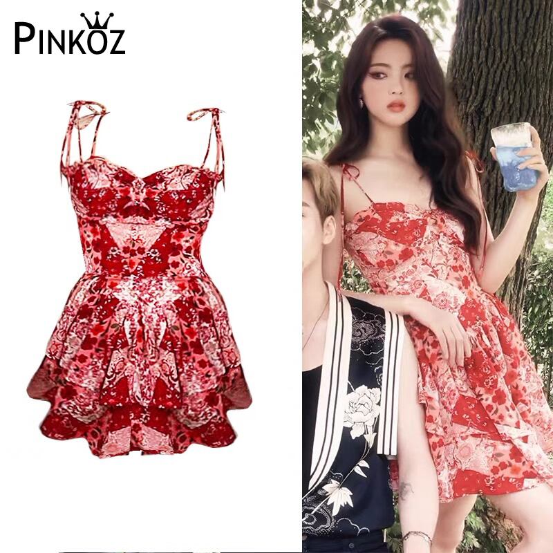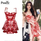 Pinkoz 花柄セクシーなボディコンミニドレス女性レッドノースリーブショートドレスパーティークラブエレガントセレブデザイナー vestidos traf ピンク