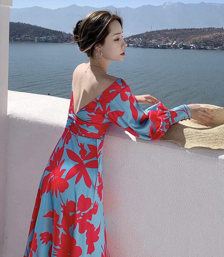 Pinkoz ヴィンテージ レッド ブルー プリント マキシ ドレス ディープ v ネック背中の開いたランタン スリーブ ハイ ウエスト ホリデー ロング ドレス ボタン vestidos za ハイウェスト ピンク ランタンスリーブ Vネック ビンテージ
