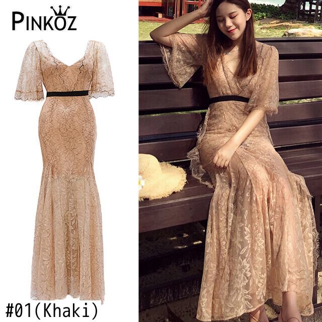 Pinkoz カーキ メッシュ レース v ネック フレア スリーブ夏ぬるぬるマキシ ドレス パーティー ヴィンテージ ファッション ファム エレガントな vestidos traf ピンク フレアスリーブ サマー 夏物 Vネック フェミニン ビンテージ