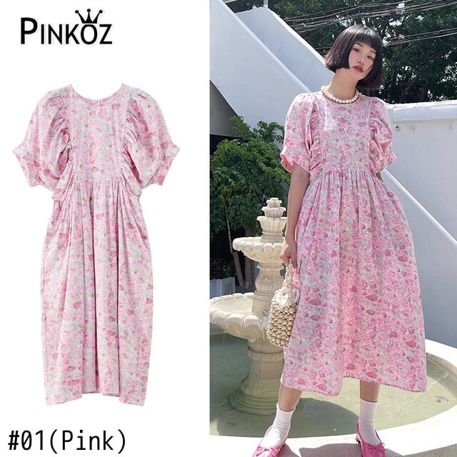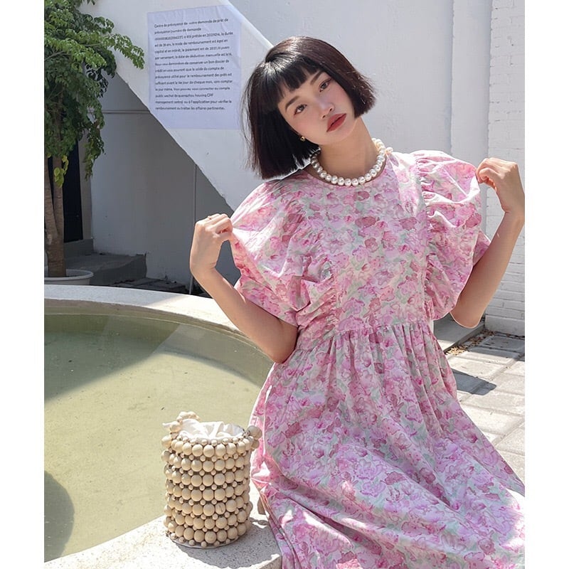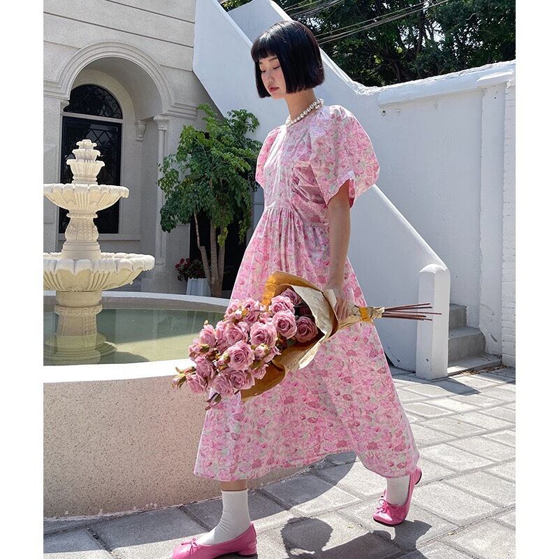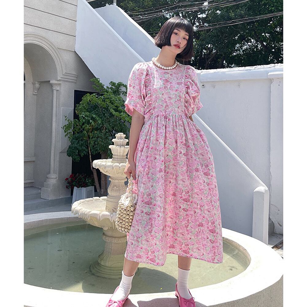 Pinkoz 春夏パフスリーブ緩いピンク甘いミディドレスフラワープリントカジュアルストリートファッションシックなローブ 大人ガーリー スウィート キュート スプリング 春物 サマー 夏物 フラワーデザイン
