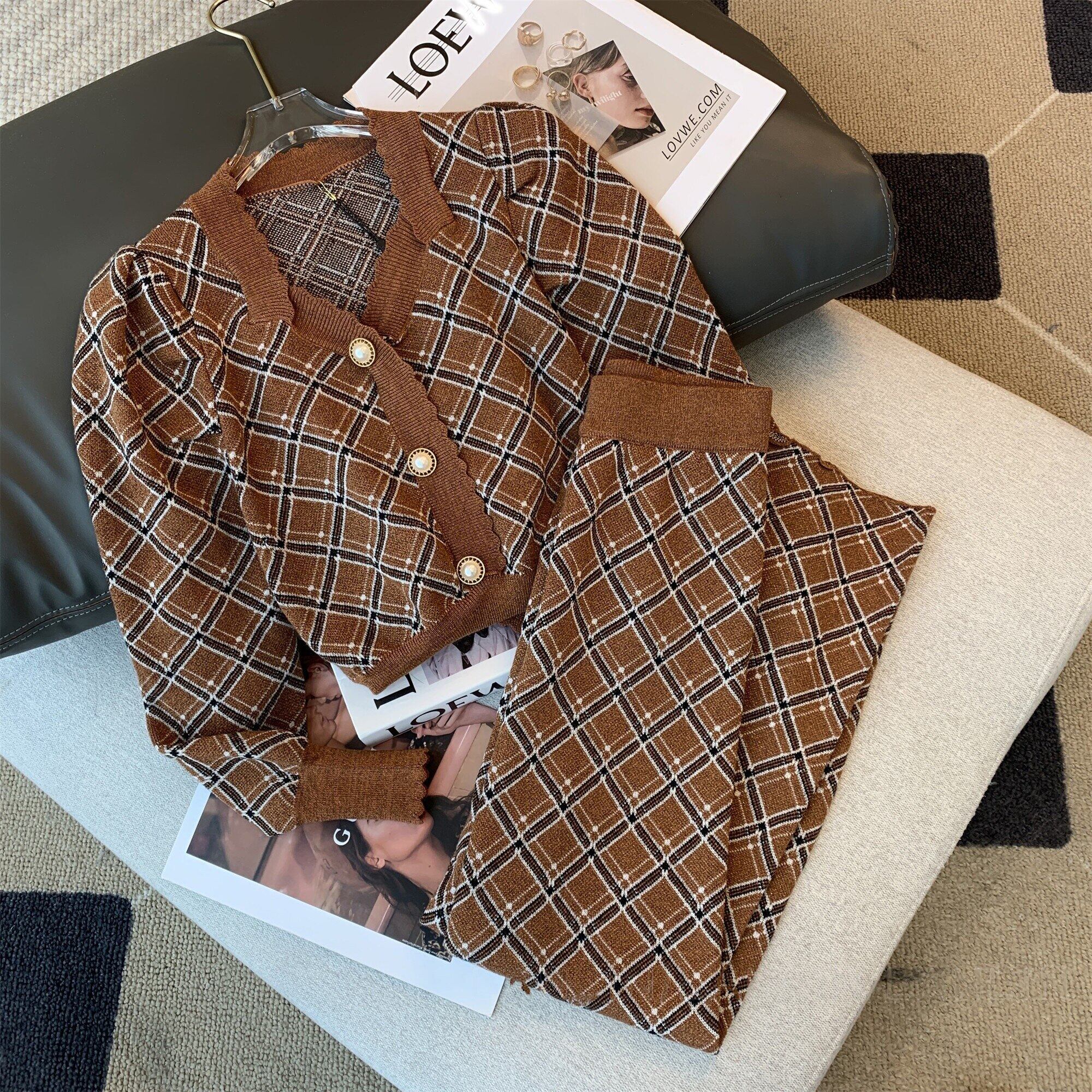 Pinkoz 2 点セット ヴィンテージ フレンチ スタイリッシュ シックなカーディガン シングル ブレスト トップ長ズボン ニット衣装スーツ デ mujer ロング ピンク ビンテージ