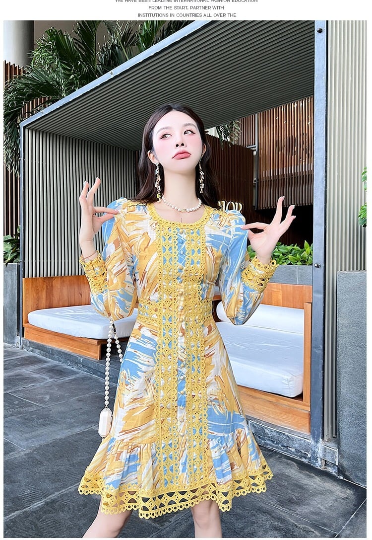 Pinkoz パッチワーク レース黄色半袖 A ライン膝丈エレガントなドレス ファム服シックなパーティー ナイト vestidos traf ショート ピンク ハーフスリーブ Aライン フェミニン