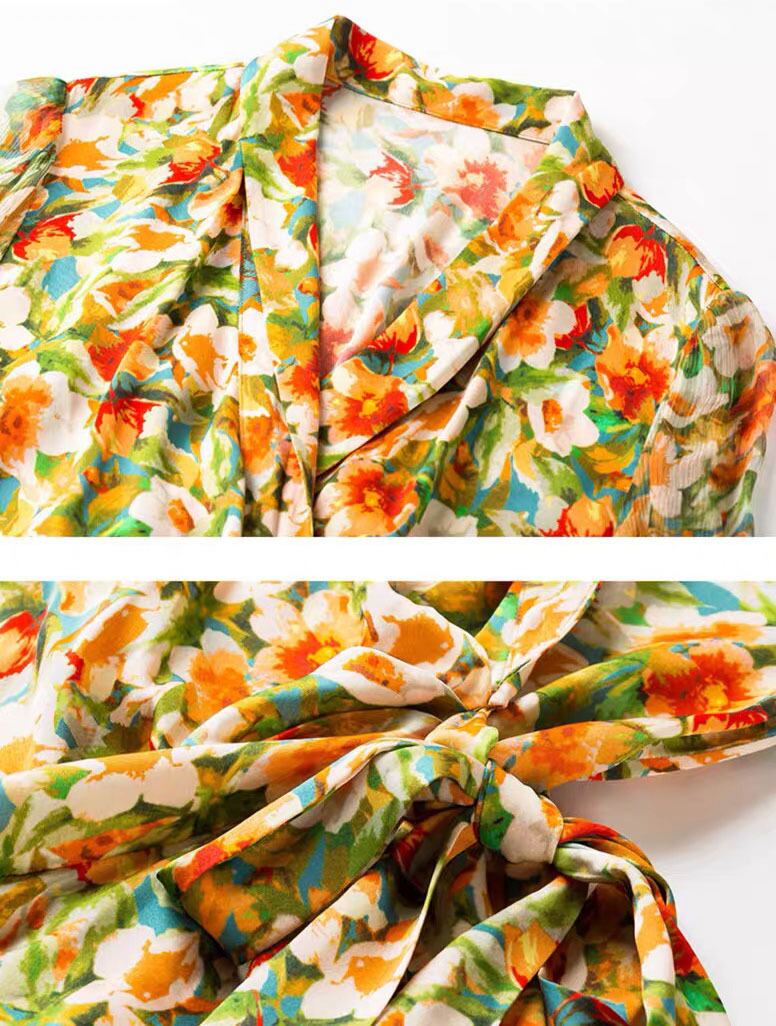 Pinkoz ランウェイ デザイナー スタイル フローラル プリント V ネック エレガント カジュアル ビーチ ミニ ドレス イエロー フラワー 非対称 ドリー ベルト付き ピンク ハーネス 花柄 Vネック フラワーデザイン
