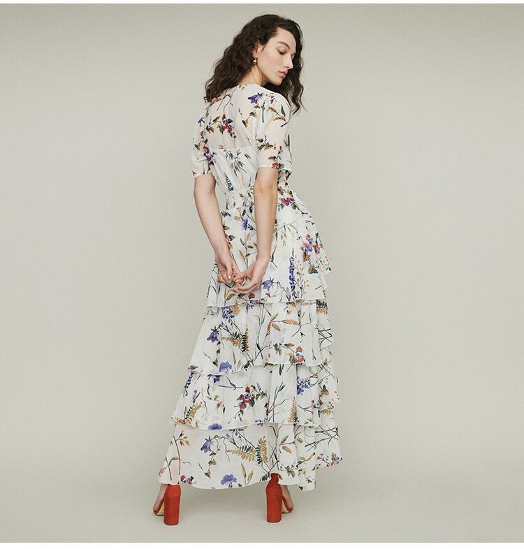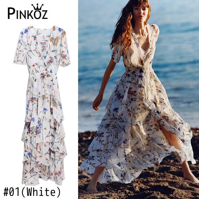 Pinkoz 滑走路デザイナー ホリデー シックなフローラル プリント v ネック半袖ファッション ドレス フリル長い vestidos robe de mujer traf ショート ロング ピンク ハーフスリーブ ラッフル 花柄 Vネック