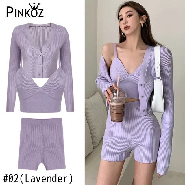 Pinkoz ファッション バイオレット ニット 3 点セット カーディガン クロップド トップス ショーツ セクシーなぬるぬる ボディコン スーツ ファム シックな衣装 traf ピンク ブルマー フェミニン