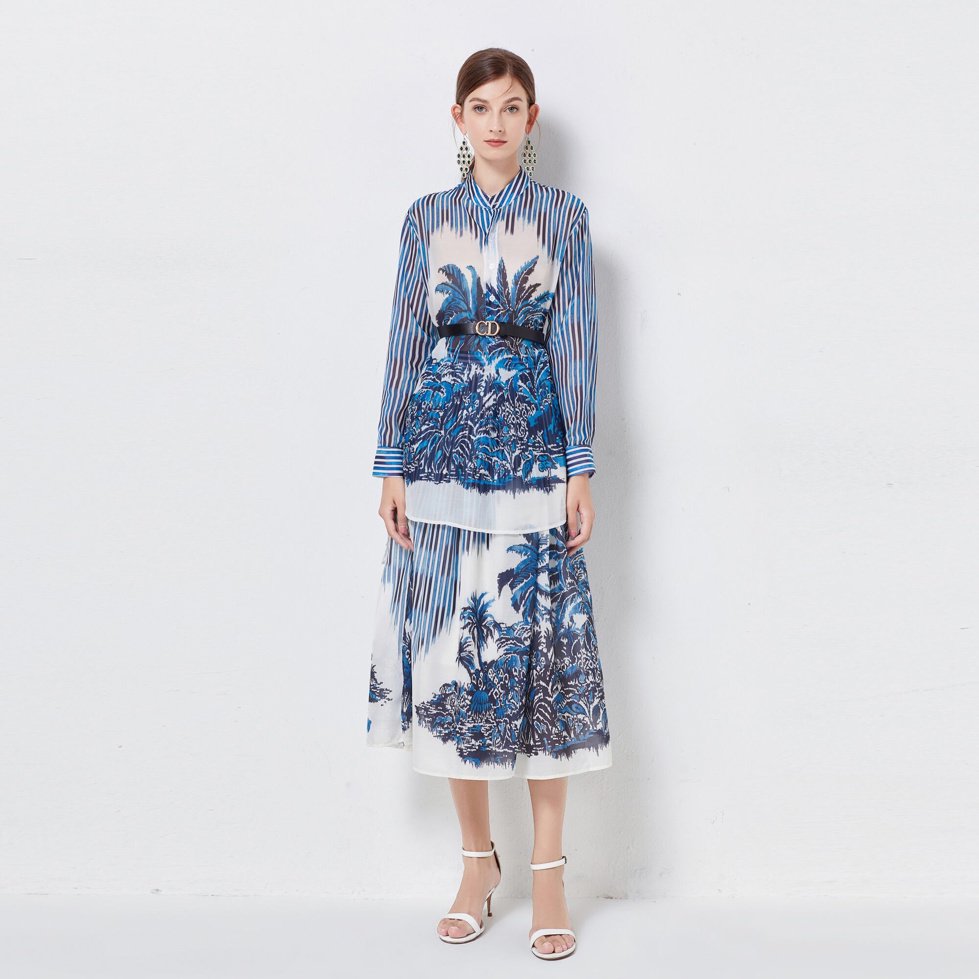 Pinkoz デザイナー新ファッションストライプトロピカルツリープリントスカートミディブルーレースアップハイウエスト skrits パーティーカジュアル高級 ハイウェスト ピンク