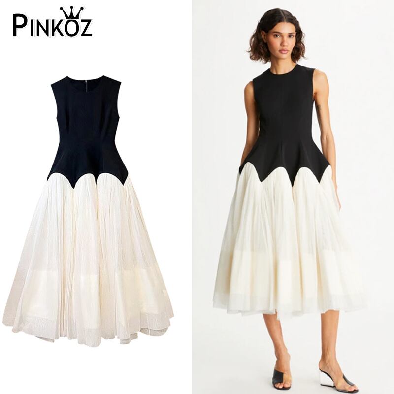 Pinkoz デザイナー滑走路ミディ ドレス タンク黒と白のパッチワーク メッシュ ガウン ボール パーティー ナイト vestidos デ mujer ヴィンテージ ピンク ホワイト ブラック ビンテージ