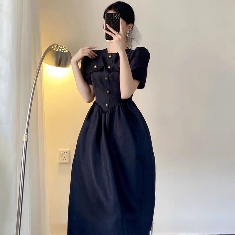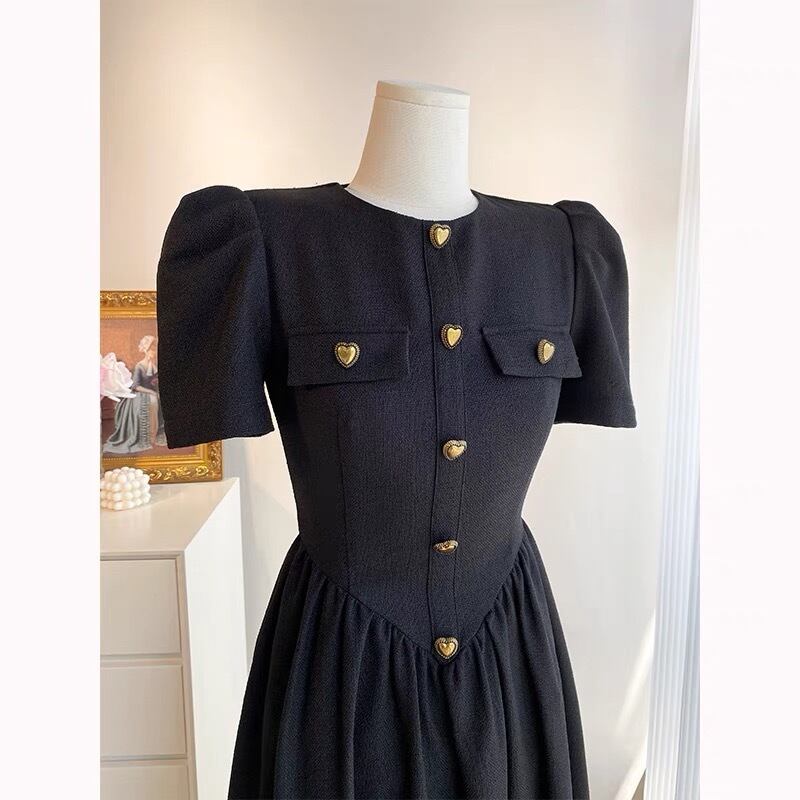 Pinkoz ヴィンテージ vestidos フレンチ エレガント ブラック ミディ ドレス ハート ラブ ボタン 半袖 夏 ヘップバーン スタイリッシュ カジュアル OL ドレス ショート ピンク ハーフスリーブ サマー 夏物 ビンテージ