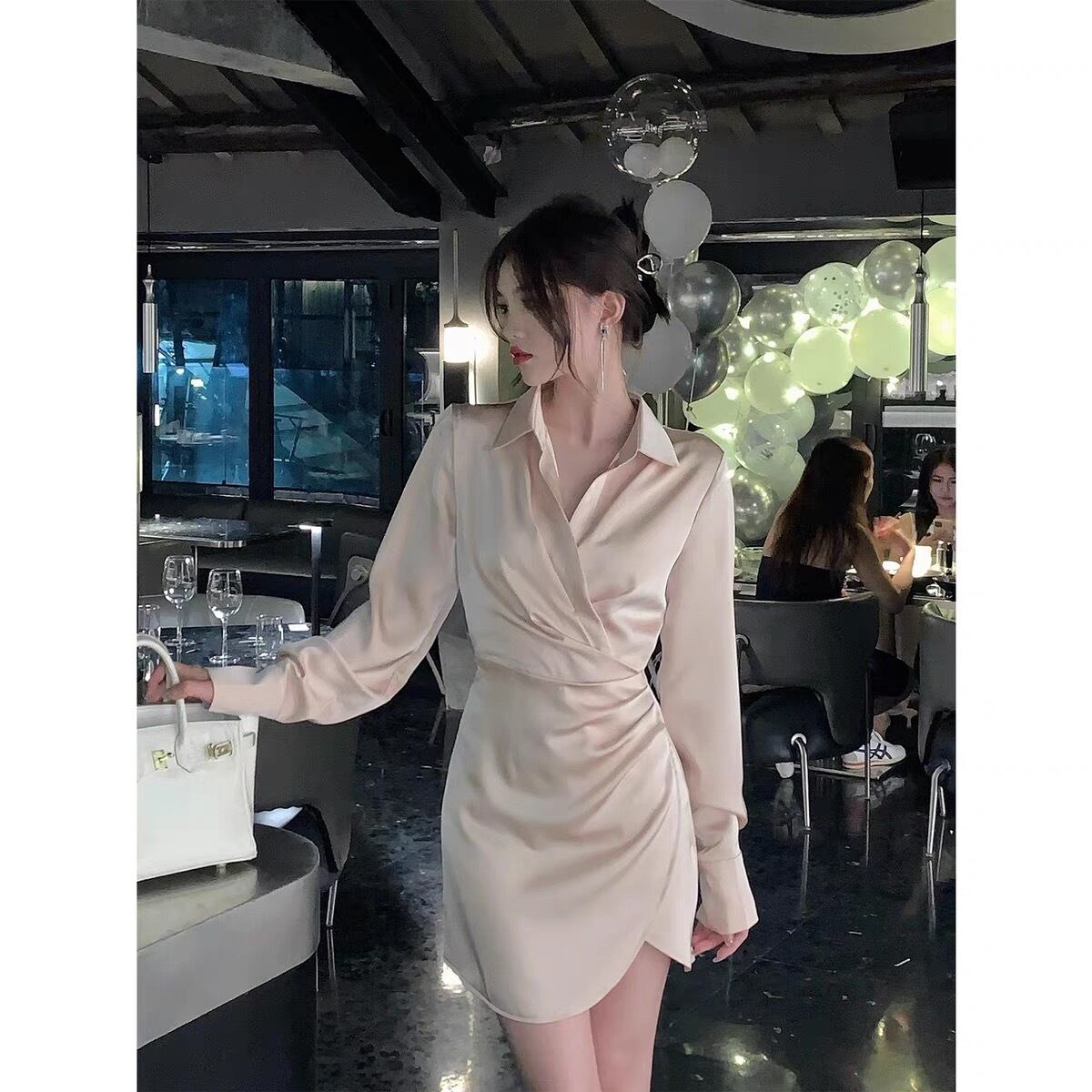 Pinkoz エレガント ヴィンテージ vestidos グリーン サテン ターン ダウン カラー シャツ ぬるぬる ドレス オフィス レディ ミニ ショート ドレス シック服 traf ピンク ビンテージ 会社 学校 通勤や通学にも