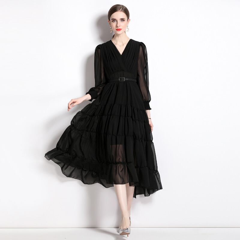 Pinkoz デザイナー グリーン V ネック プリーツ A ライン長袖夏春グリーン ミディ ドレス ロング パーティー ローブ デ mujer + ベルト ピンク スプリング 春物 サマー 夏物 ハーネス Vネック Aライン