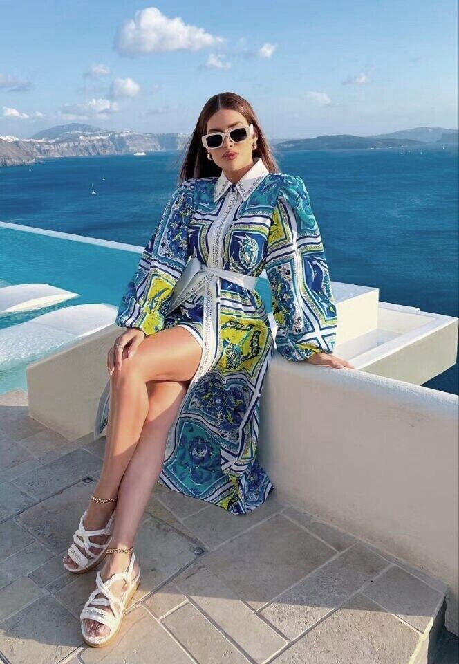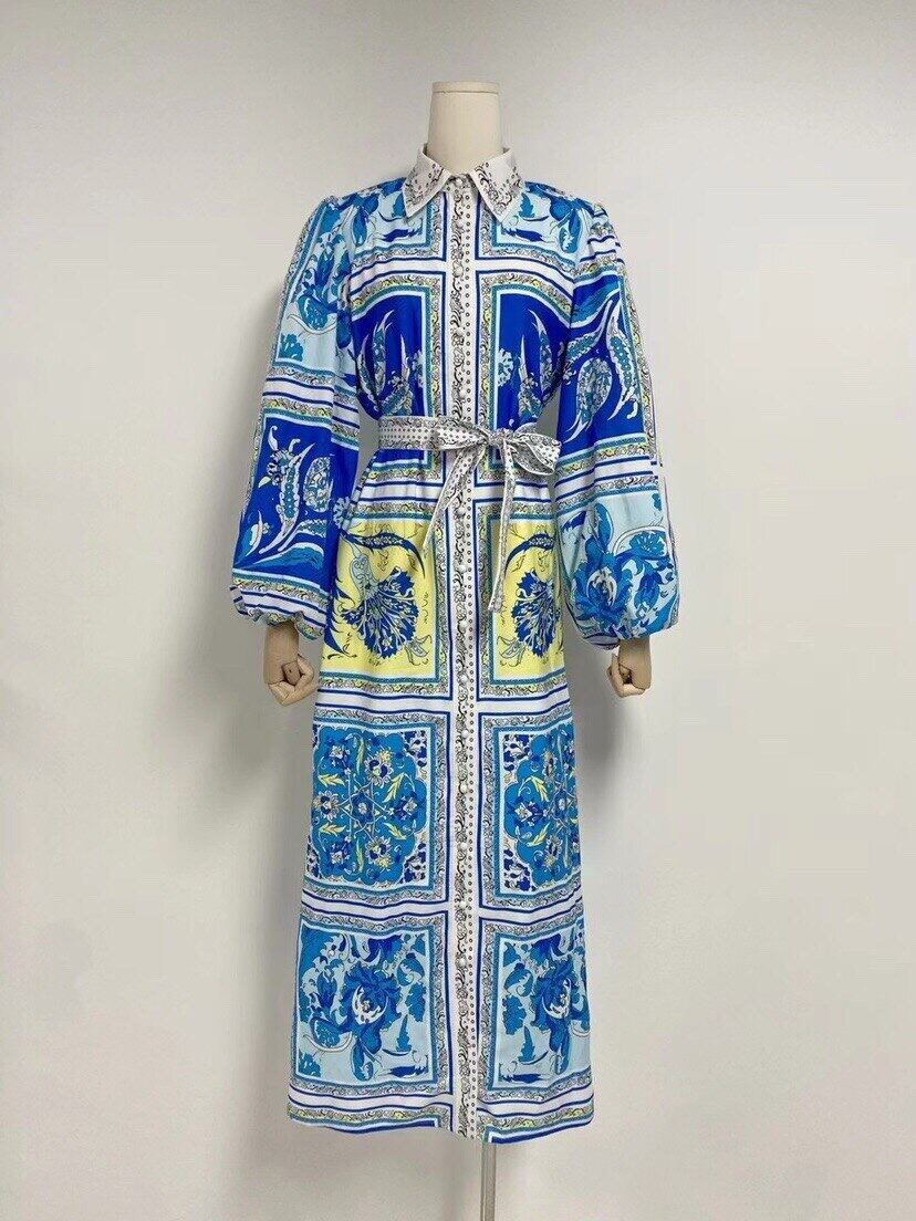Pinkoz デザイナー スタイリッシュミディ ドレス自由奔放生きるシングル ブレスト ランタン スリーブ チェック柄フローラル プリント ルーズ カジュアル ドレス ベルト付き ピンク ランタンスリーブ ハーネス 花柄