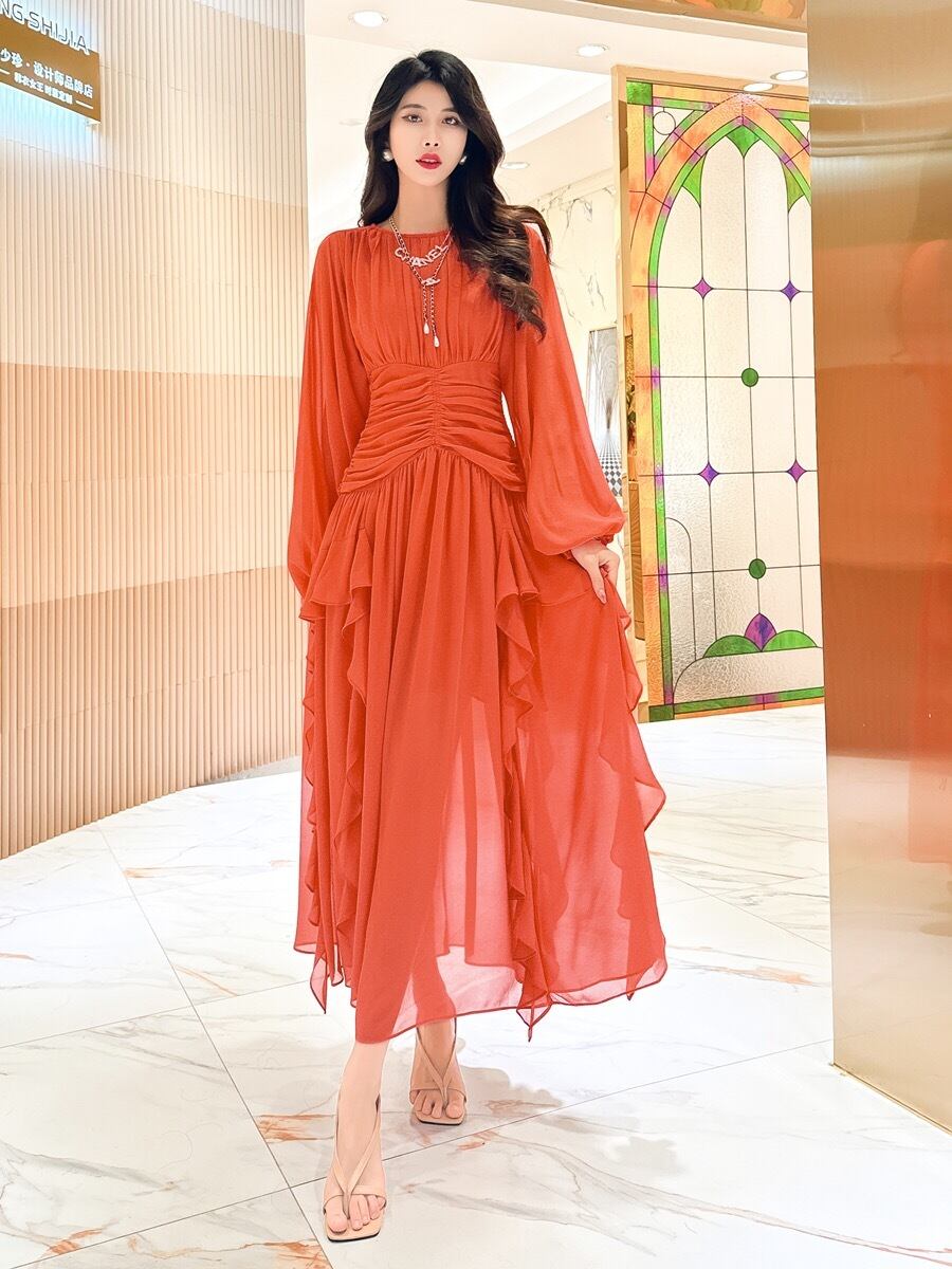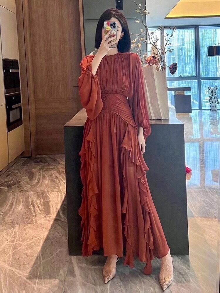 Pinkoz デザイナー ブルーエレガントヴィンテージ vestidos O ネック ランタン スリーブ フリル高級ミディ ドレス夏休みパーティー ローブ mujer ピンク ランタンスリーブ ラッフル サマー 夏物 Oネック ビンテージ