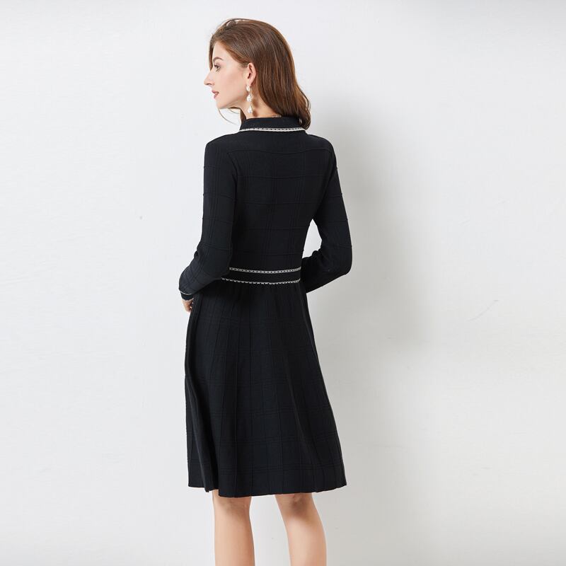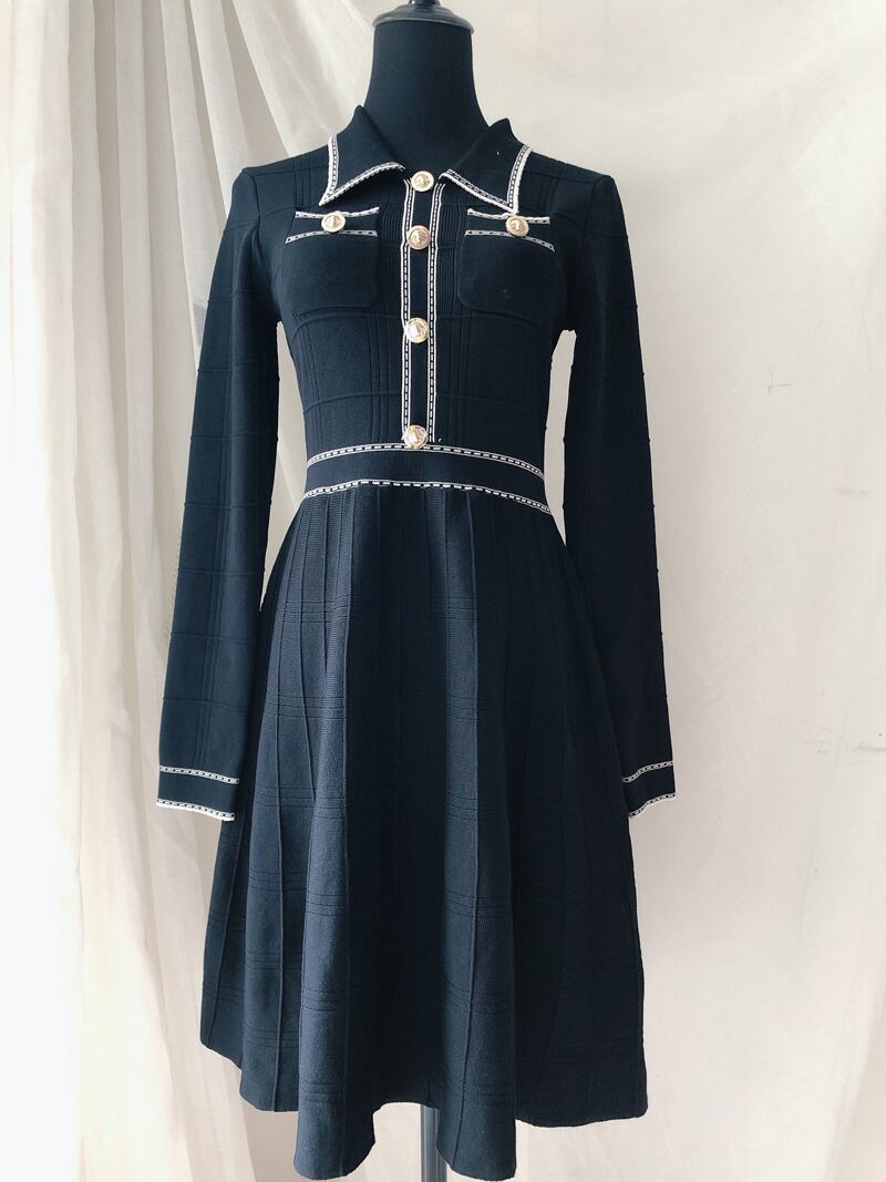 Pinkoz 黒ミニドレス A ライン蜂ボタンターンダウン襟ハイウエストゴシックエレガントニットドレス vestidos シック ハイウェスト ピンク ブラック Aライン