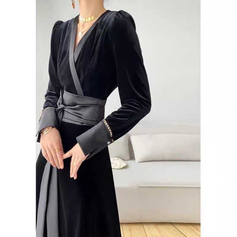 Pinkoz 滑走路デザイナー v ネック ミディ ドレス オフィス レディ エレガントベルベット秋冬ローブ デ mujer 金属チェーン ヴィンテージ vestidos ピンク オータム 秋物 ウィンター 冬物 Vネック ビンテージ 会社 学校 通勤や通学にも