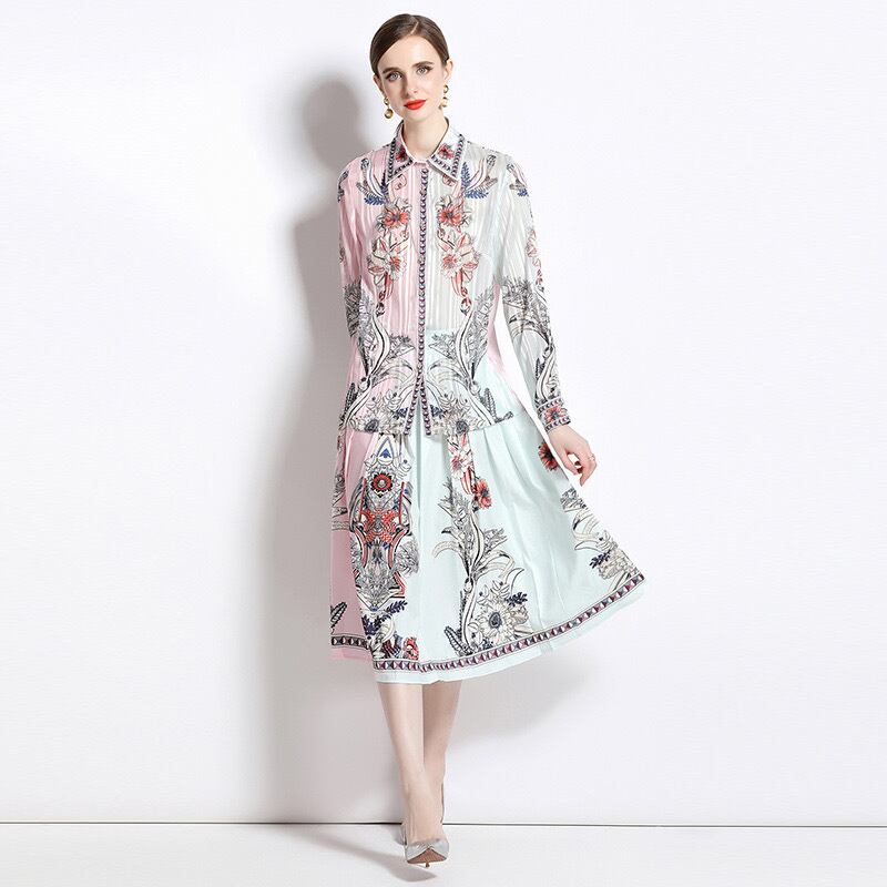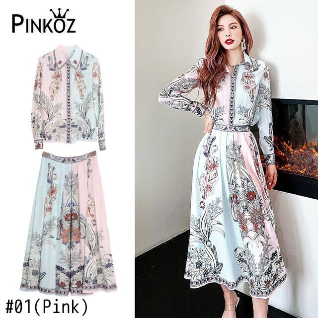 Pinkoz デザイナー レディース 2点セット ターンダウンカラー 長袖 花柄 プリント カジュアル エレガント シャツ トップス ミディスカート ロング ピンク