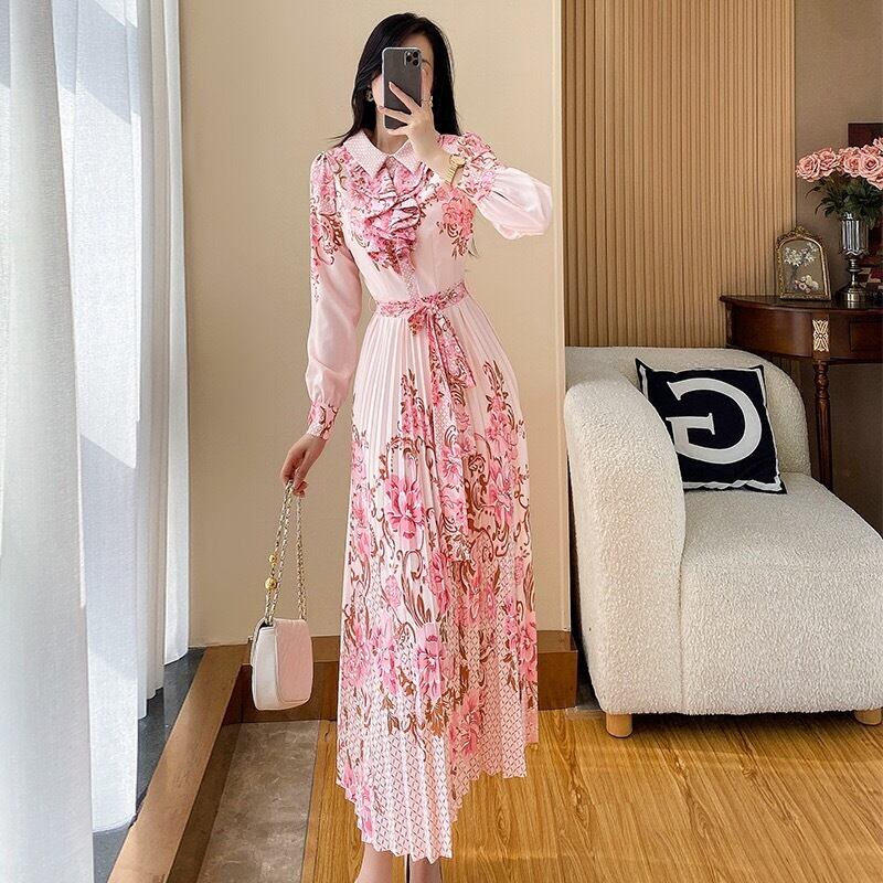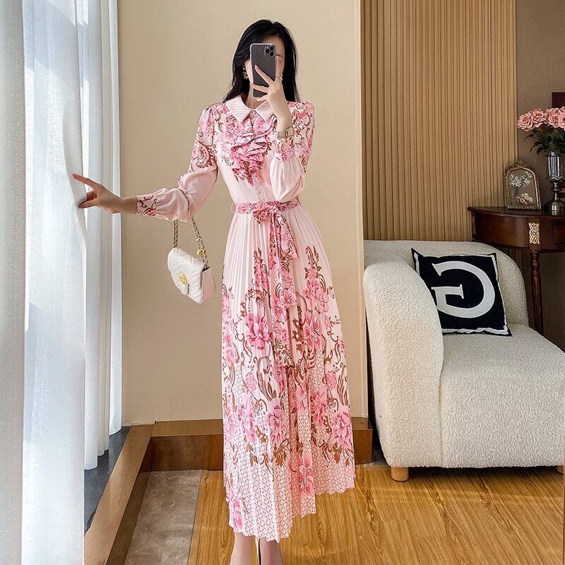Pinkoz エレガントミディ ドレス ターン ダウン襟長袖ファム フリル花柄プリント プリーツ レース アップ ドレス オフィス レディ ヴィンテージ ロング ピンク ラッフル フェミニン レースアップ ビンテージ 会社 学校 通勤や通学にも