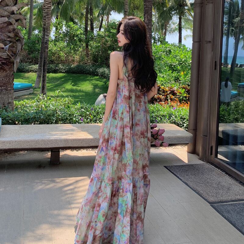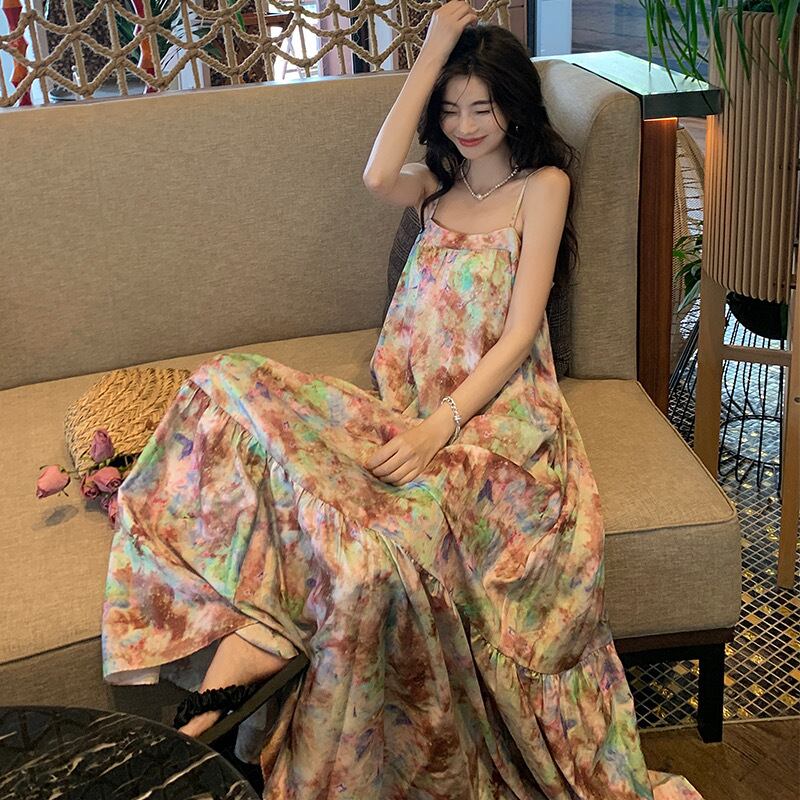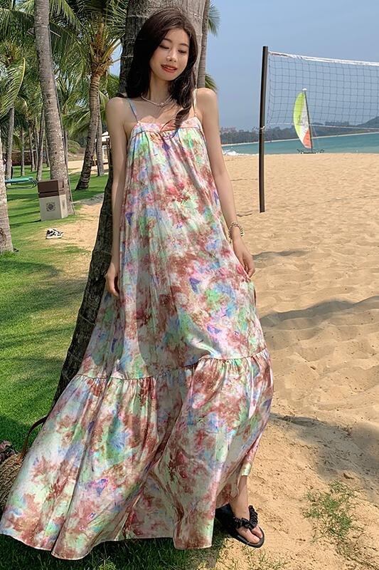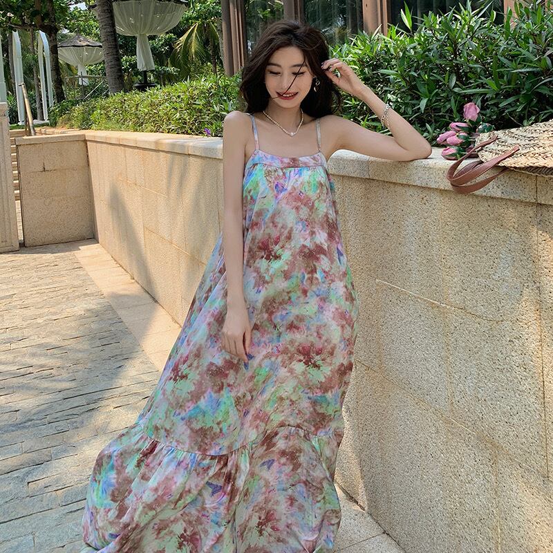 Pinkoz サマー ホリデー ルーズ ロング ドレス 花柄 プリント スパゲッティ ストラップ キャミソール ビーチ シックファッション ローブ デ ムジェー 自由奔放生きる vestidos ピンク 夏物