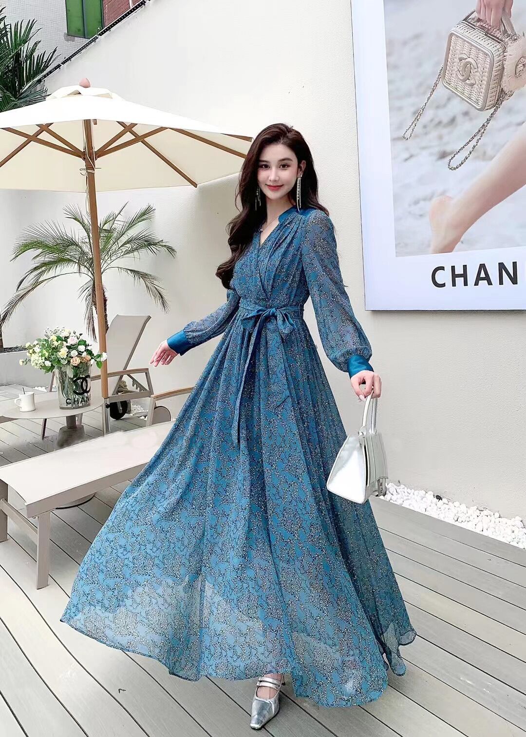 Pinkoz 夏春ブルーフローラルプリント長袖シフォンマキシ A ラインドレスパーティーナイトエレガント vestidos ロング ピンク スプリング 春物 サマー 夏物 花柄 Aライン