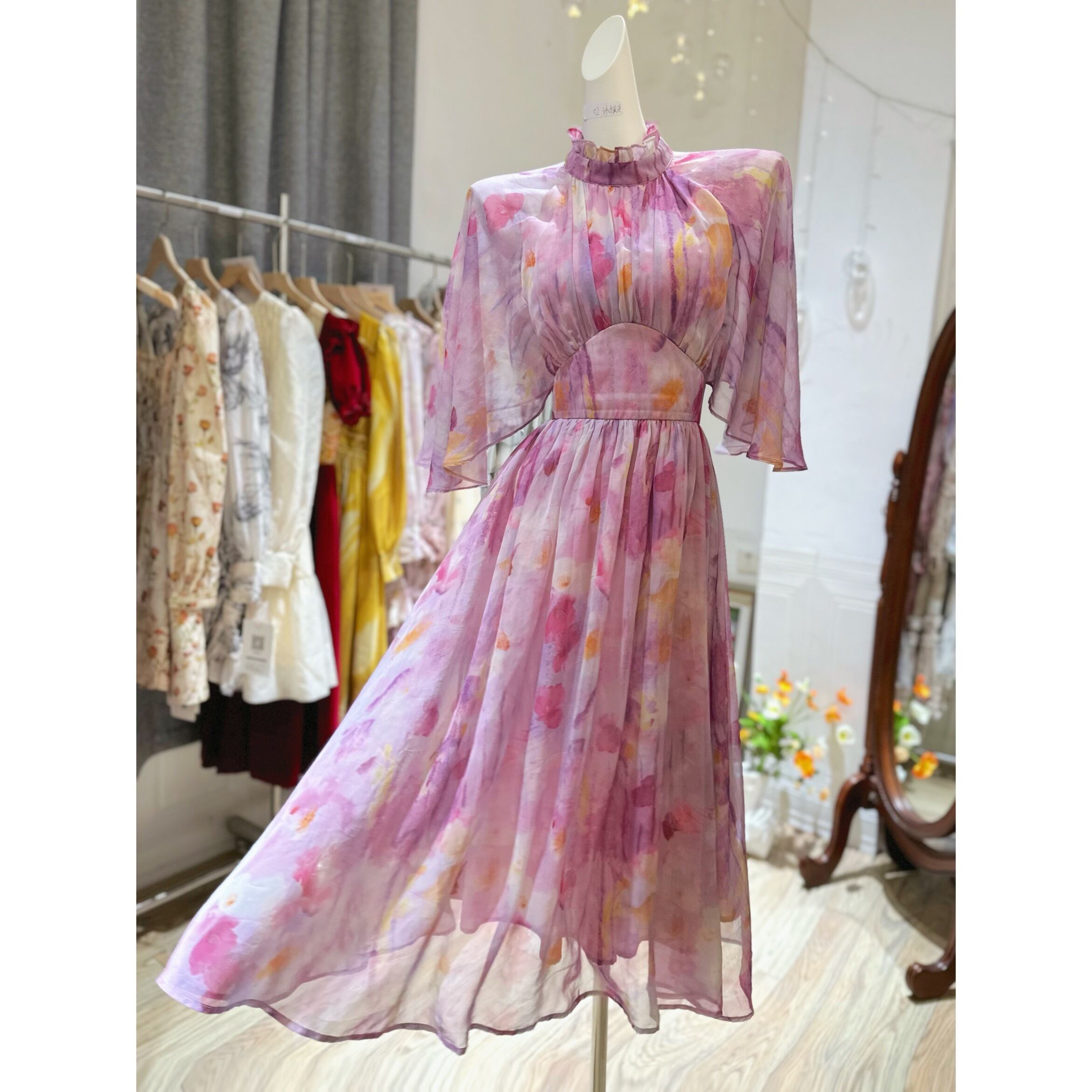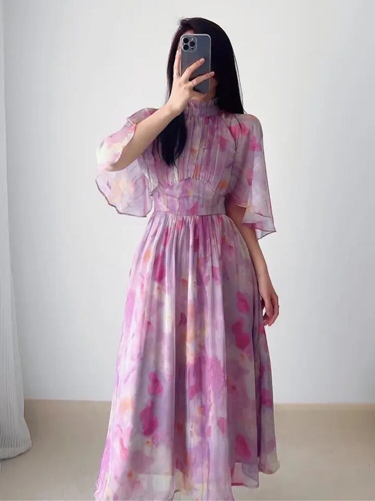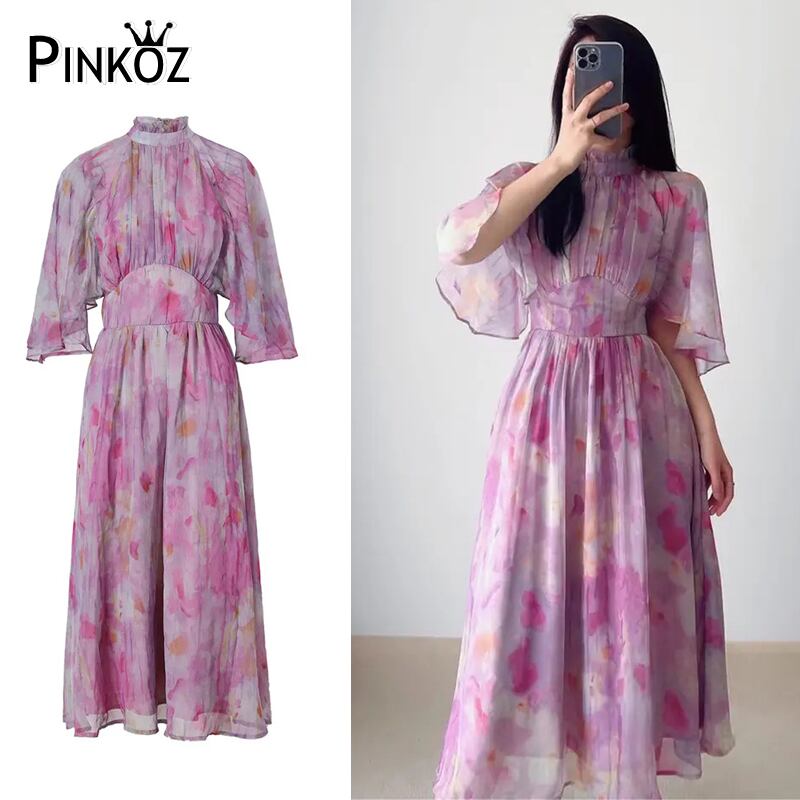 Pinkoz マルドレス花柄スタンドカラーバタフライスリーブ夏ハイウエストミディドレス vestidos パラ mujer traf ハイウェスト ピンク サマー 夏物