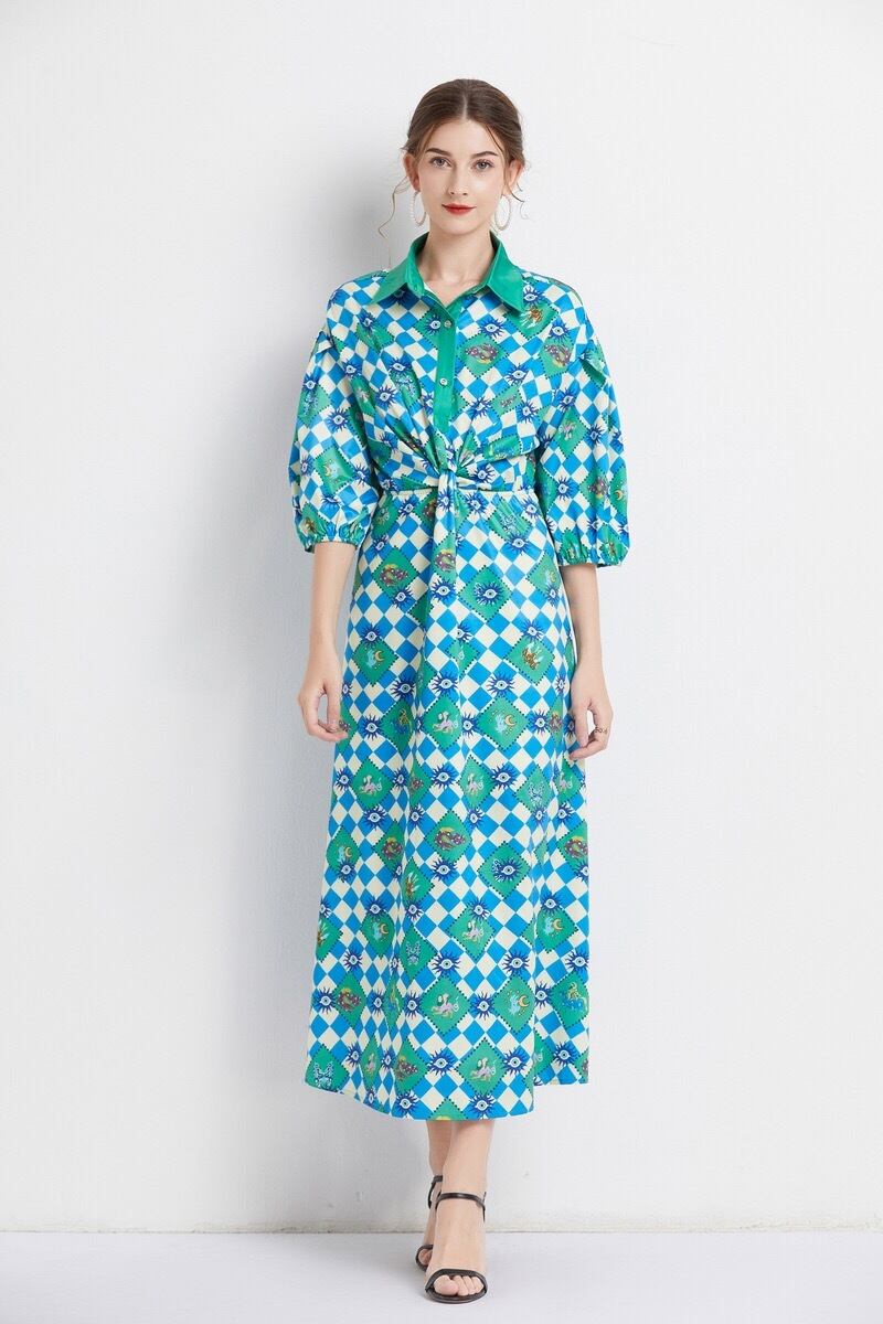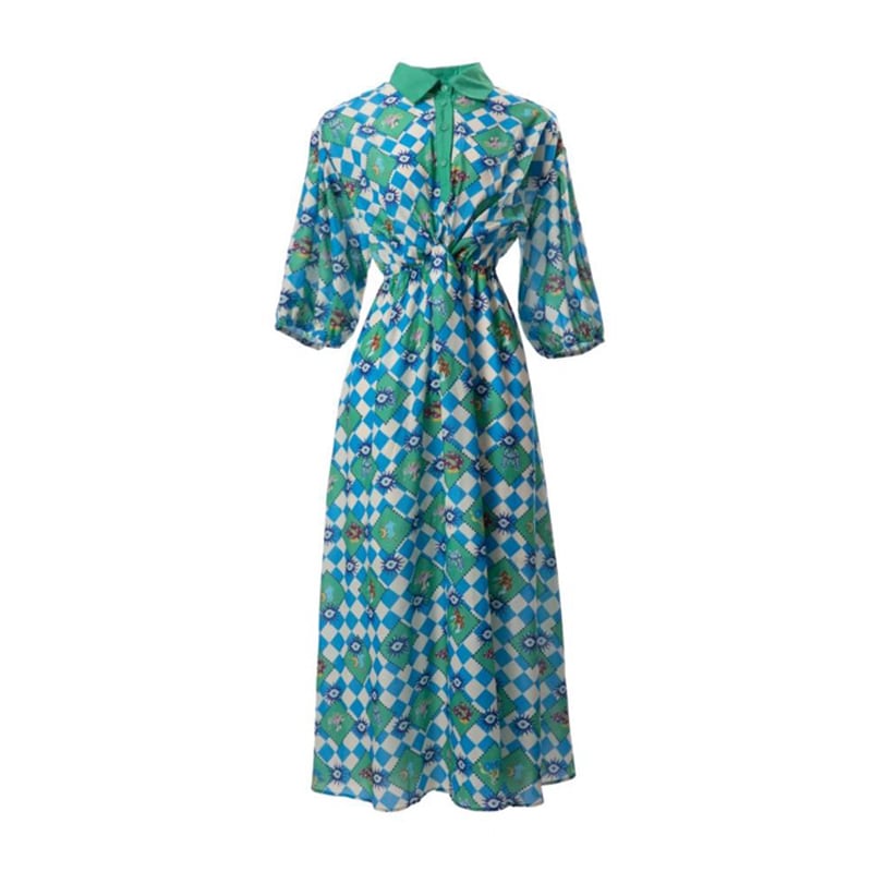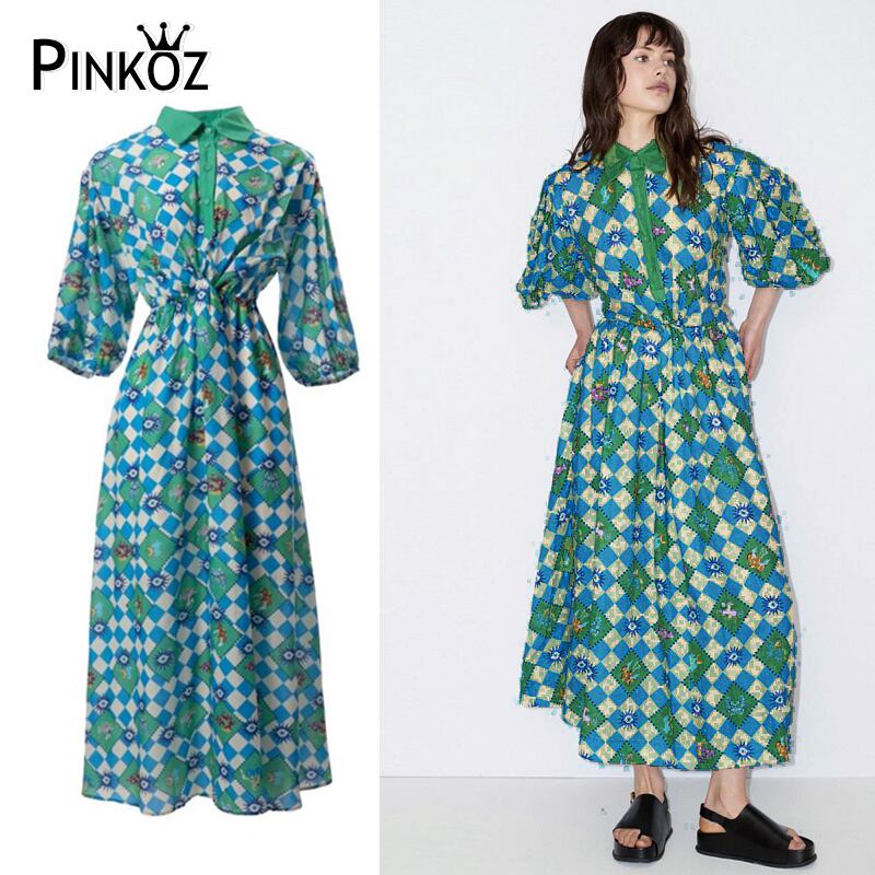 Pinkoz デザイナー背中開いたターン ダウン襟パフ スリーブ夏グリーン ブルー チェック柄ミディ ドレス A ライン vestidos 自由奔放生きるヴィンテージ za ピンク サマー 夏物 Aライン ビンテージ
