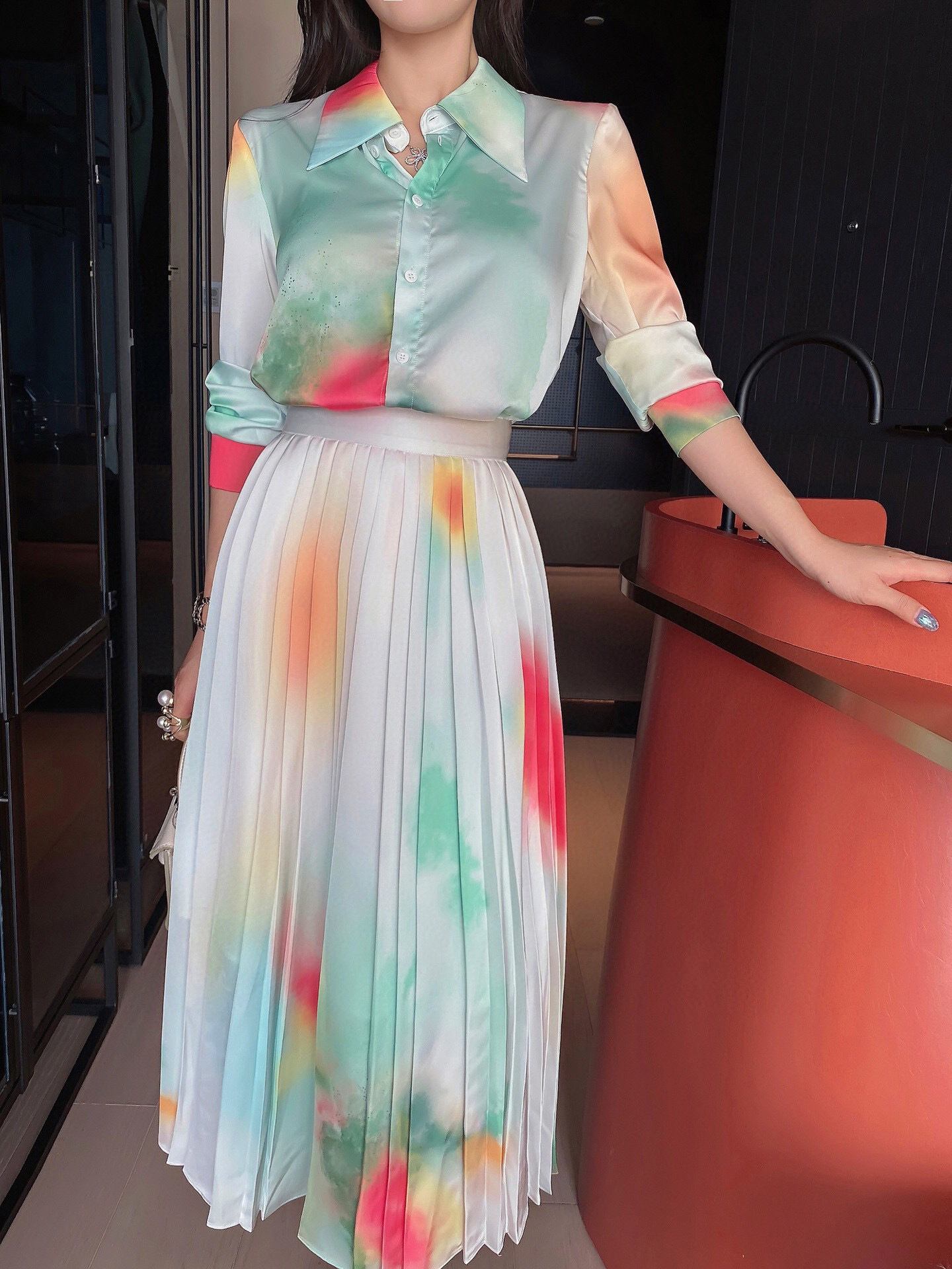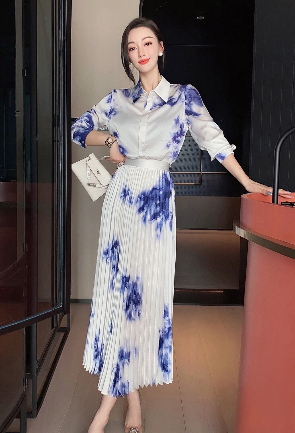Pinkoz 2点セット 上品 白 青 プリント シャツ ゆったり ブラウス トップス プリーツスカート ファッション 衣類 OL 仕事着 ヴィンテージ ピンク ホワイト ブルー エレガント ビンテージ