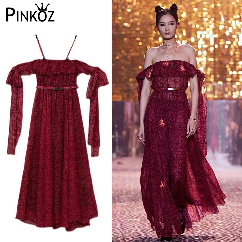 Pinkoz ヒョウ プリント スラッシュ ネック マキシ レッド ドレスシフォン レース アップ フリル パーティー イブニング ファム ドレス新しい ピンク ラッフル フェミニン レースアップ