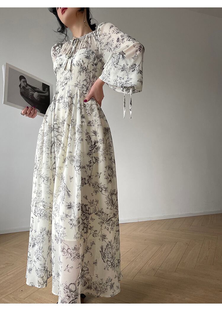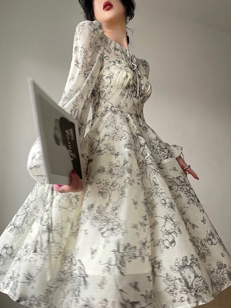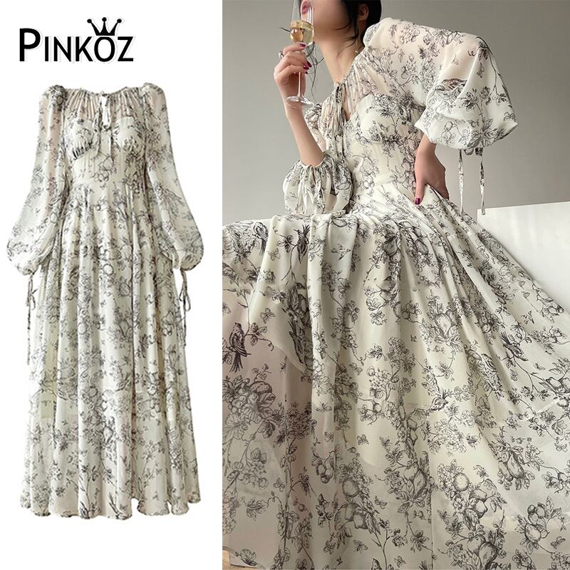 Pinkoz デザイナーグレーフラワープリントレースアップランタンスリーブ春夏ミディドレスカジュアルデイリーパーティー vestidos traf ピンク スプリング 春物 サマー 夏物 フラワーデザイン