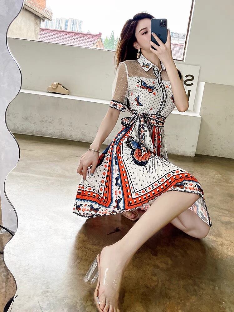 Pinkoz ミディドレス蝶アニマルプリントプリーツエレガントホワイトハイウエストドレス半袖 vestidos traf ハイウェスト ショート ピンク ハーフスリーブ