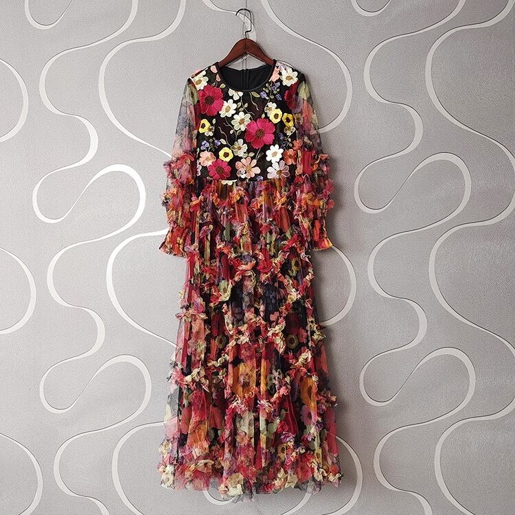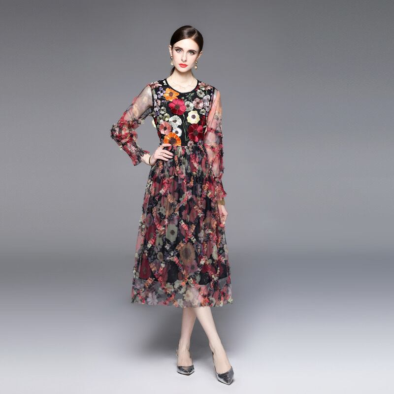 Pinkoz デザイナードレスフラワーアップリケ O ネックフルスリーブ夏春パーティー高級ドレスパッチワークメッシュミディローブ za ピンク スプリング 春物 サマー 夏物 Oネック フラワーデザイン