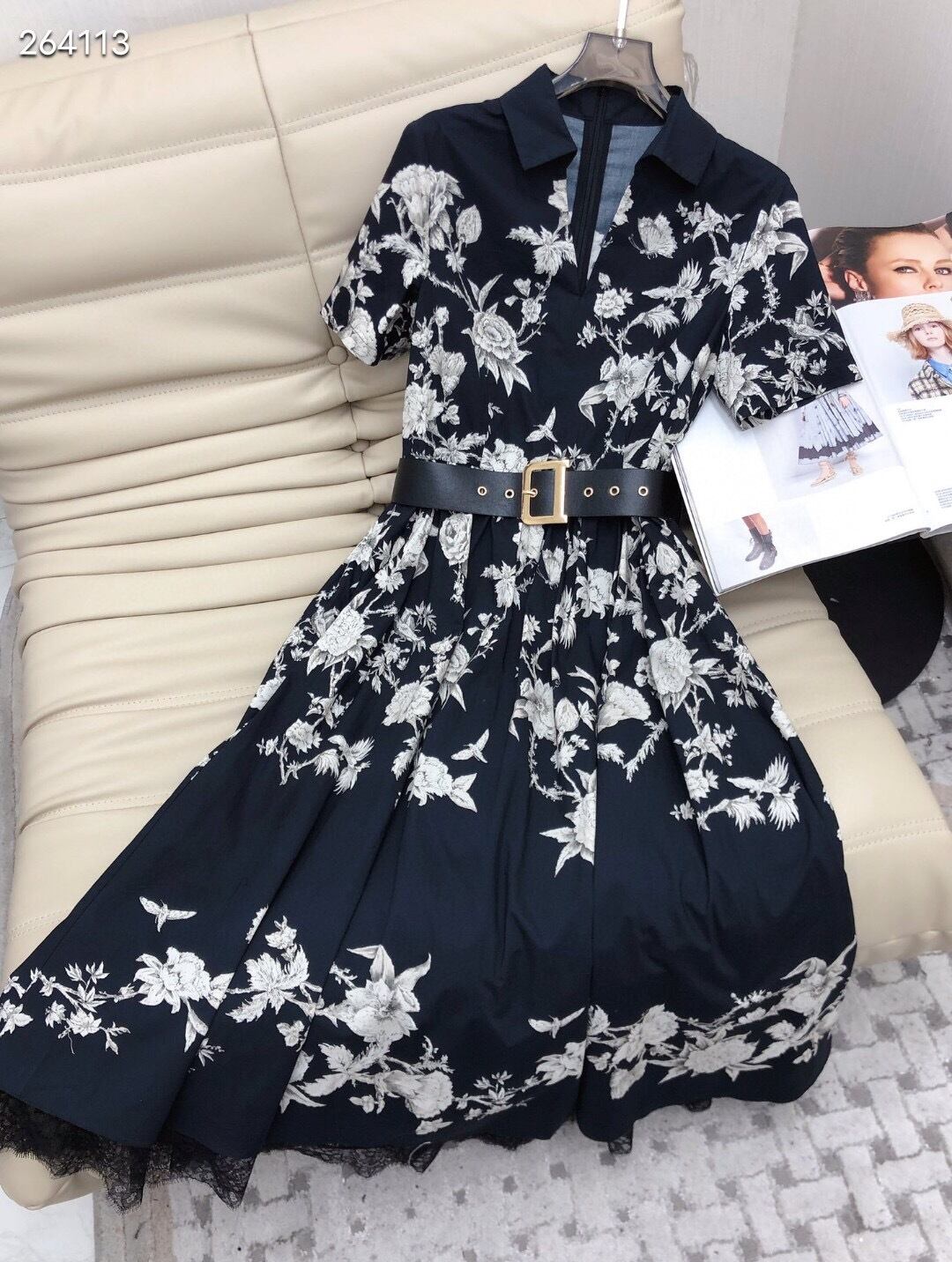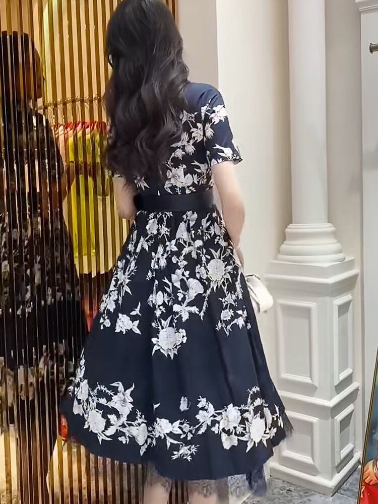 Pinkoz 滑走路デザイナー黒花柄プリント パッチワーク レース ターン ダウン襟シングル ブレスト ドレス パーティー エレガントローブ ベルト ピンク ブラック ハーネス