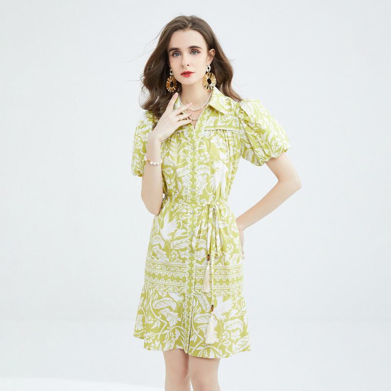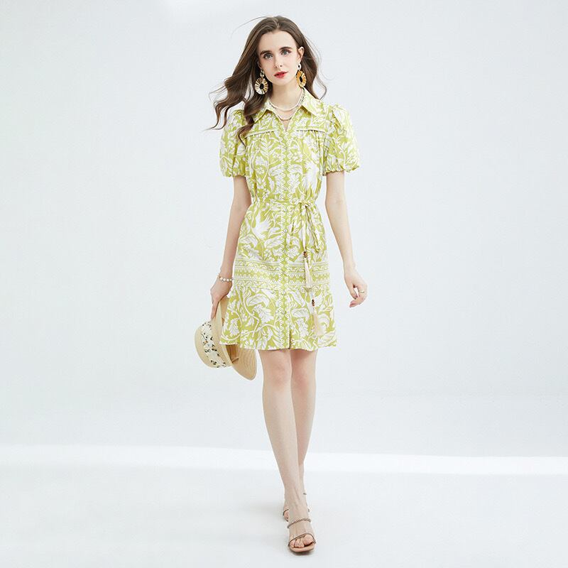 Pinkoz 夏パフ スリーブ ターン ダウン襟ミニ ドレス シングル ブレスト A ライン サッシュ パッチワーク レース自由奔放生きるファッション vestidos ピンク サマー 夏物 Aライン