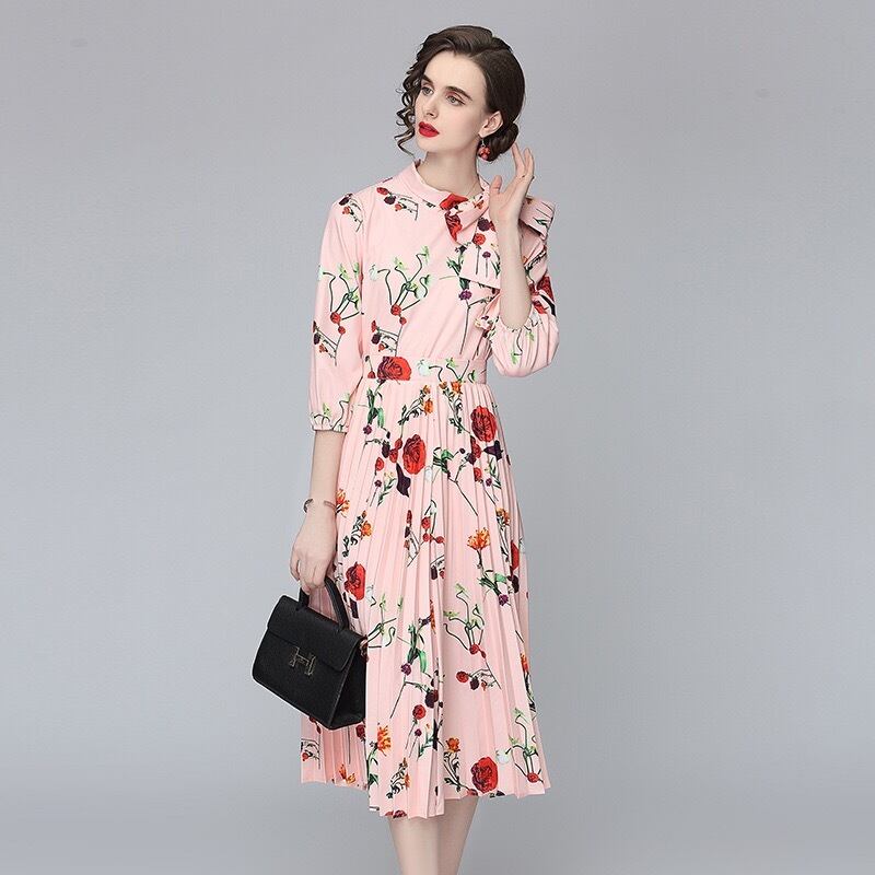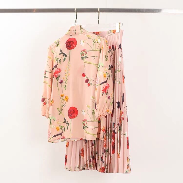 Pinkoz 2 点セット ピンク フラワー プリント レースアップ エレガント レディー ブラウス トップス ミディ プリーツ スカート オフィス クロシン パーティー シック 座 フラワーデザイン 会社 学校 通勤や通学にも