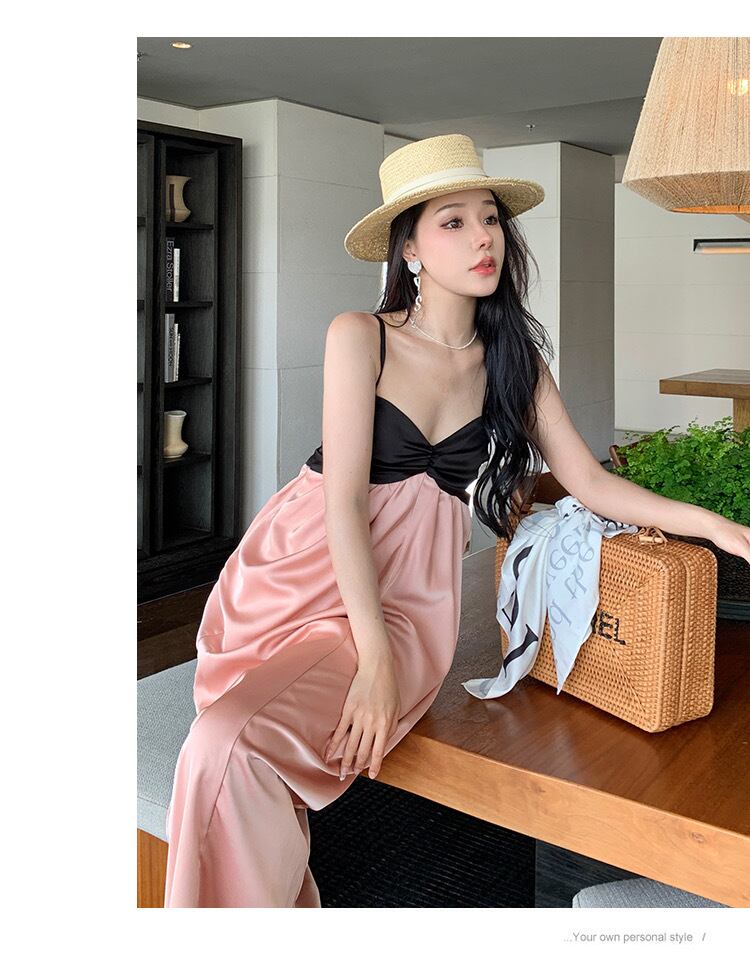 Pinkoz パーティー ミディ ドレス スパゲッティ ストラップ パッチワーク ピンク ブラック キャミソール夏夜シックファッション ローブ デ muejr vestidos za サマー 夏物