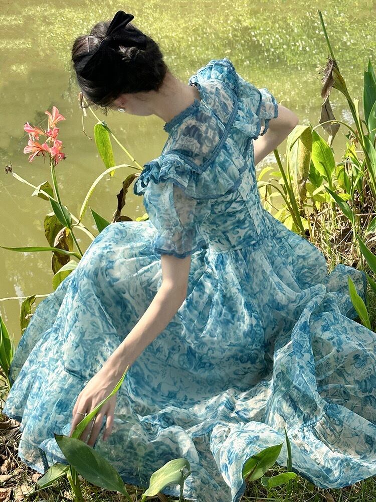 Pinkoz ヴィンテージ vestidos ブルー花柄スタンド カラー ビクトリア朝スタイリッシュ A ライン ミディ ドレス シャーリング サマー ドレス vestidos za ピンク 夏物 Aライン ビンテージ
