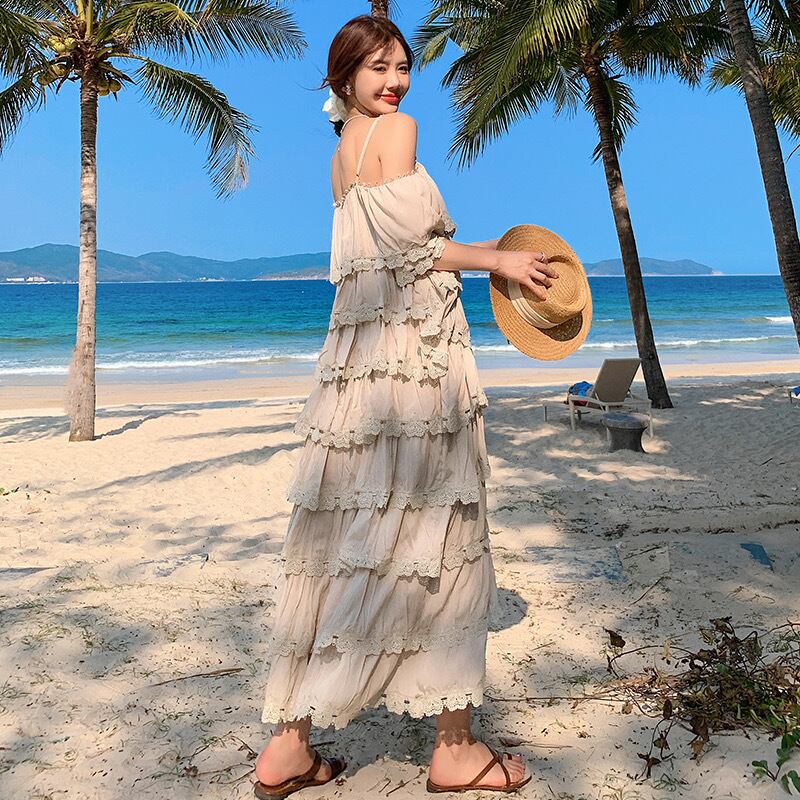 Pinkoz ベージュ サマー ミディ ドレス カスケード レイヤード フリル スパゲッティ ストラップ ルーズ シック ドレス ボヘミアン ローブ デ ムエル ビーチ ファッション za ピンク レッド ラッフル 夏物