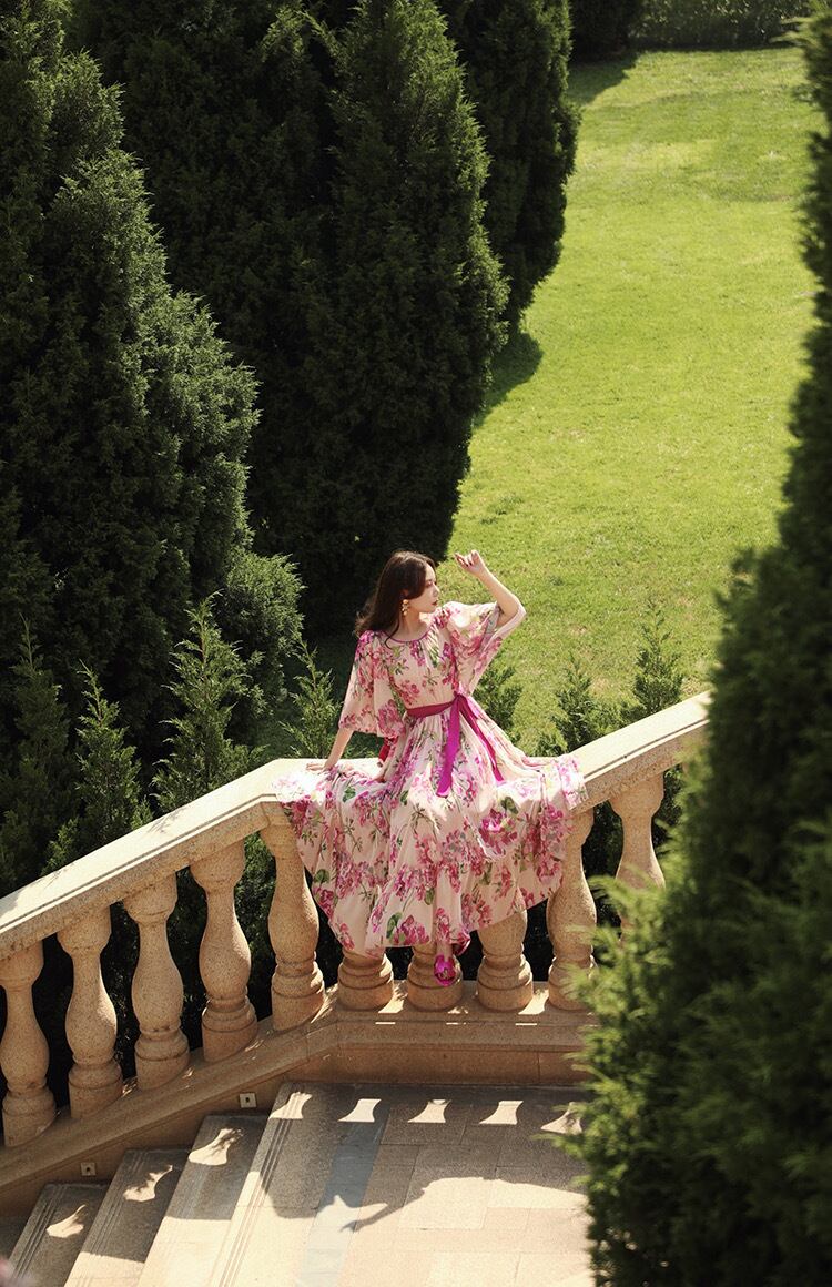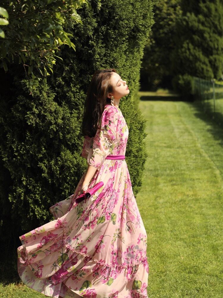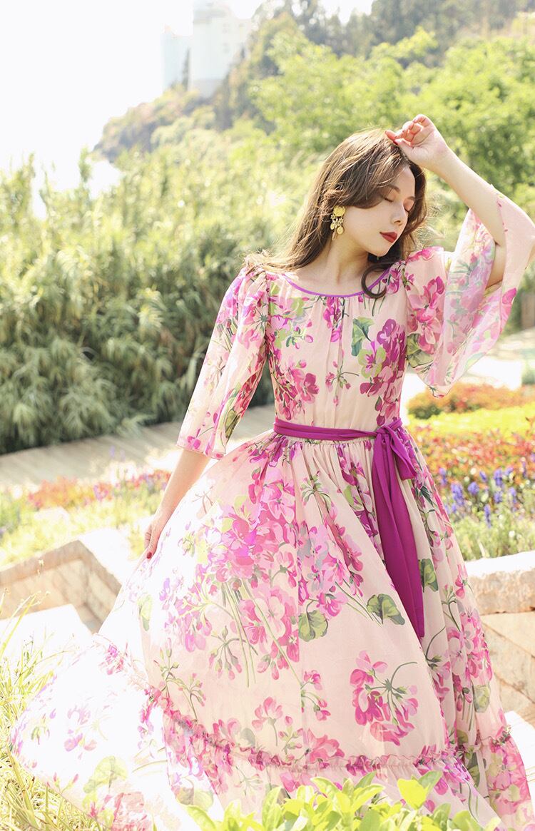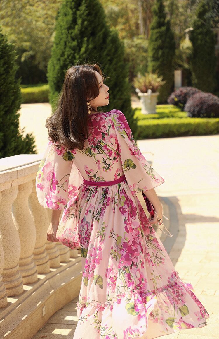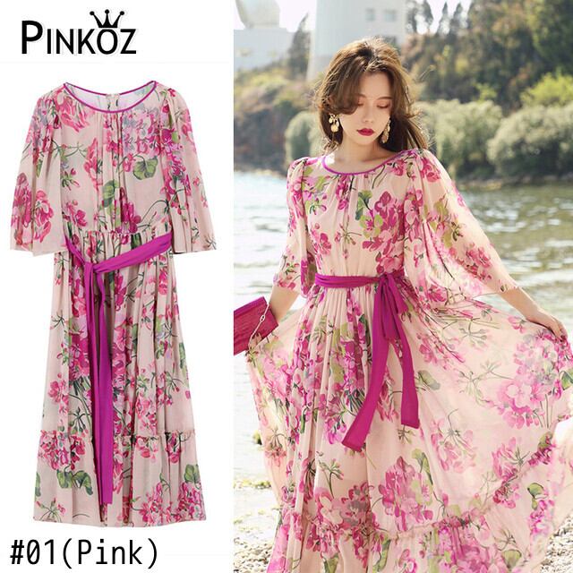 Pinkoz デザイナー花プリント シフォン y ミディ パッチワーク シャーリング ドレス蝶春夏パーティー ローブ ビッグ サイズ 3XL ピンク スプリング 春物 サマー 夏物 花柄