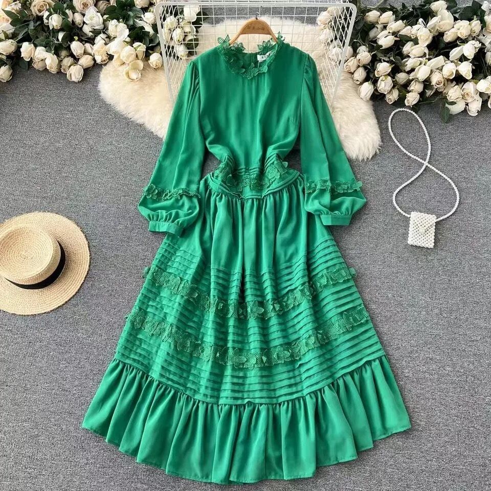 Pinkoz デザイナーグリーンアップリケ花パッチワーク o ネック高級マキシドレスパーティーイブニングローブデ mujer シック ピンク Oネック フラワーデザイン