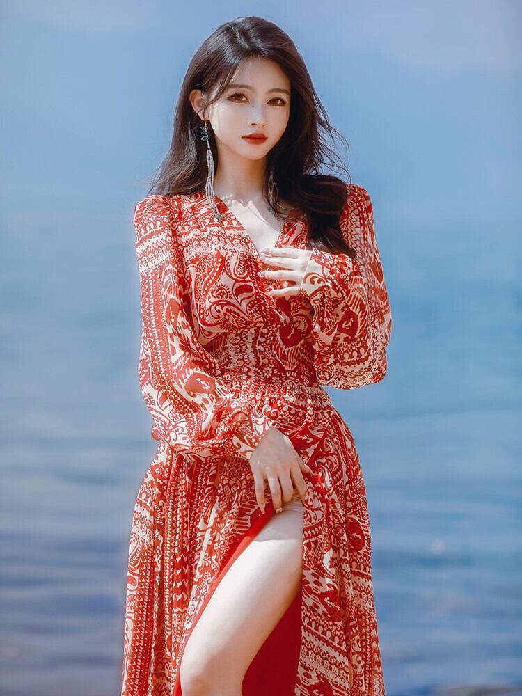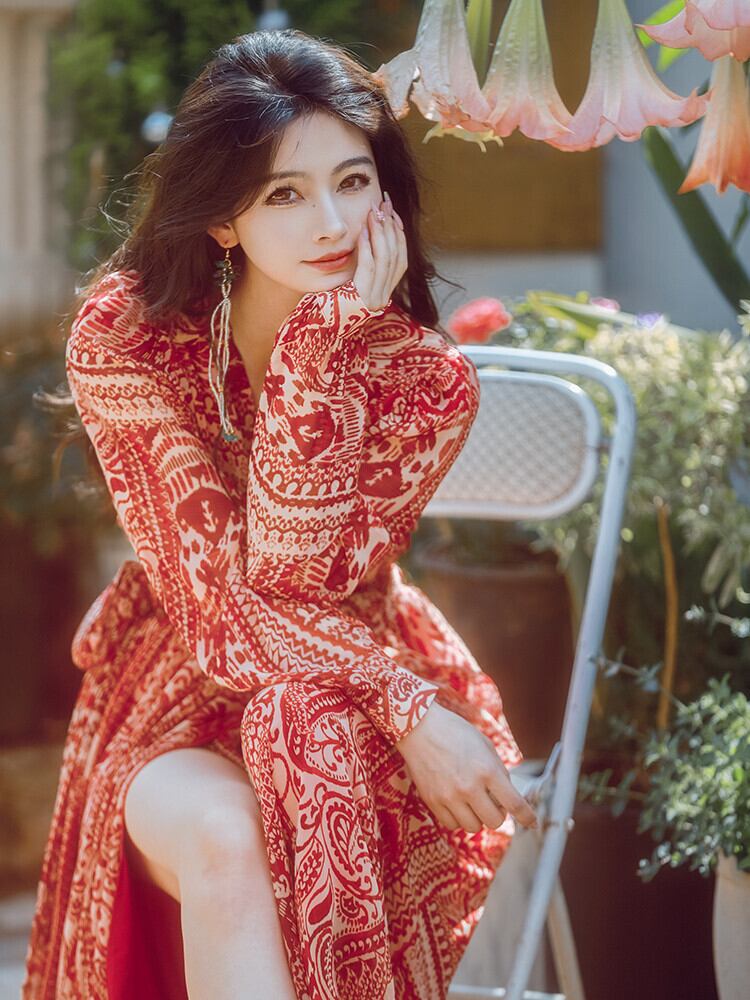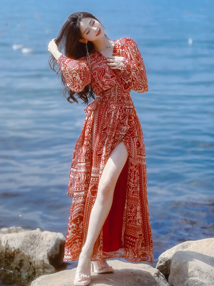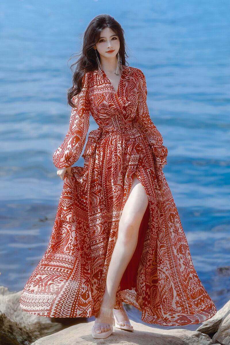Pinkoz 赤チェック柄プリント v ネックレースアップマキシドレスラップハイウエスト夏春パーティーナイトドレス vestidos ヴィンテージ ハイウェスト ピンク レッド スプリング 春物 サマー 夏物 Vネック ビンテージ